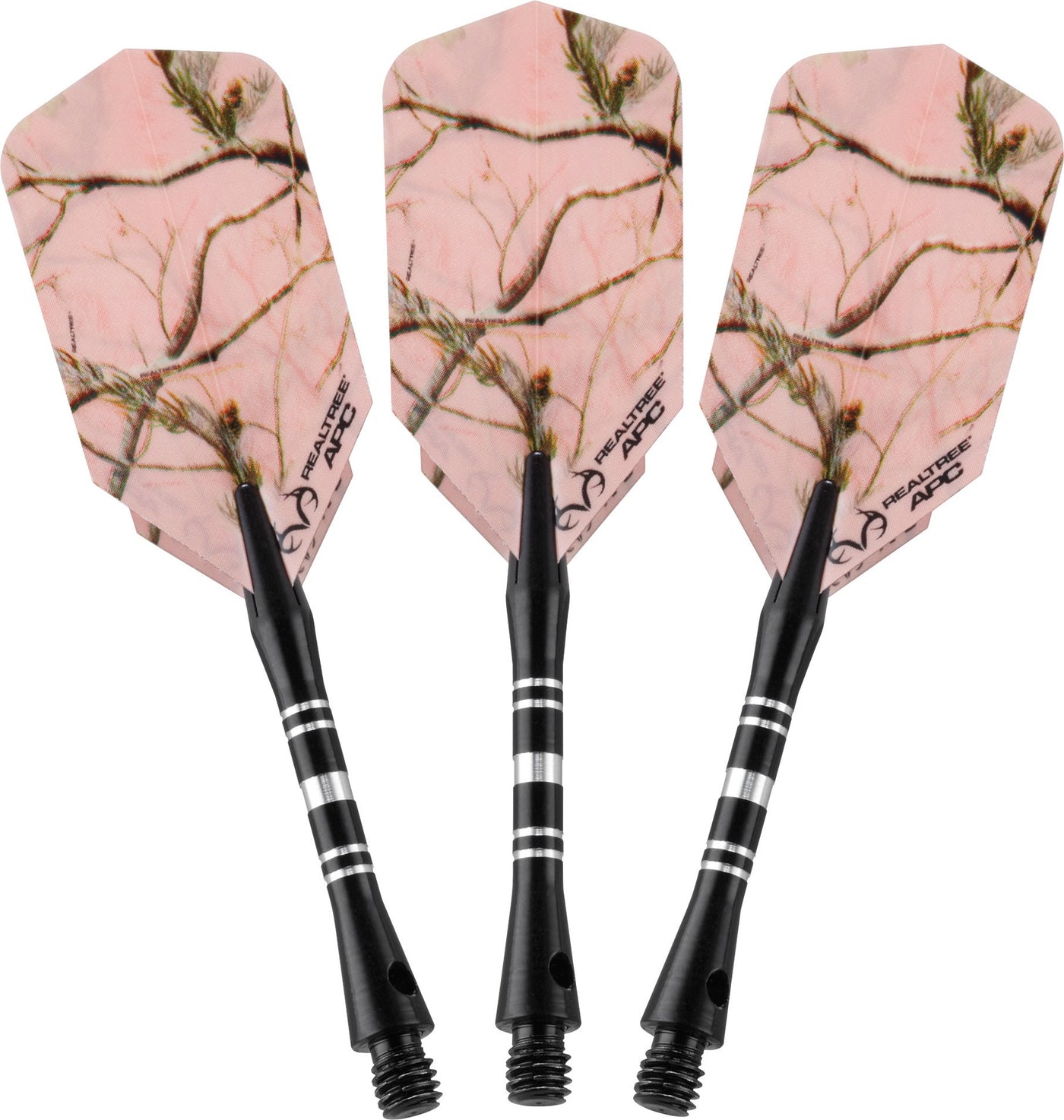 The Fat Cat Realtree APC Pink Camo soft tip darts are designed with high quality, nickel silver plated barrels which offer exceptional balance and styling in a slim profile. Having a slim profile dart barrel is necessary to obtain a closer grouping of darts to maximizing scoring. Intended for use with electronic dartboards and are ideal for casual-to-intermediate level players. Each barrel has strategically placed knurled bands, deep grooves and rings that make excellent gripping points and encourages consistent hand placement. Fat Cat APC Pink Camo darts are equipped with heavy-duty, lightweight aluminum shafts with locking holes and diamond-cut etchings. Locking holes in the shaft allow for a tighter fitting to the barrel that improves stability and greatly reduces the need to retighten during play. Quality flights help increase speed and reduce drag, producing a consistent flight path for pinpoint accuracy; detailed graphics are prominently displayed for added flare. These darts feature 2BA Tufflex Tips II soft tip dart points that have a reinforced cone, making them extremely strong and durable. Simply twist for a tight, secure fitting and easy removal. The barrels are compatible with all 2BA sized corkscrew thread dart points. These darts include an additional set of convex nylon shafts, flights, 2BA dart points and a dart mechanic wrench. The Fat Cat APC Pink Camo darts and accessories are fashionably stored and protected in the slim-profile, hard-shell case.