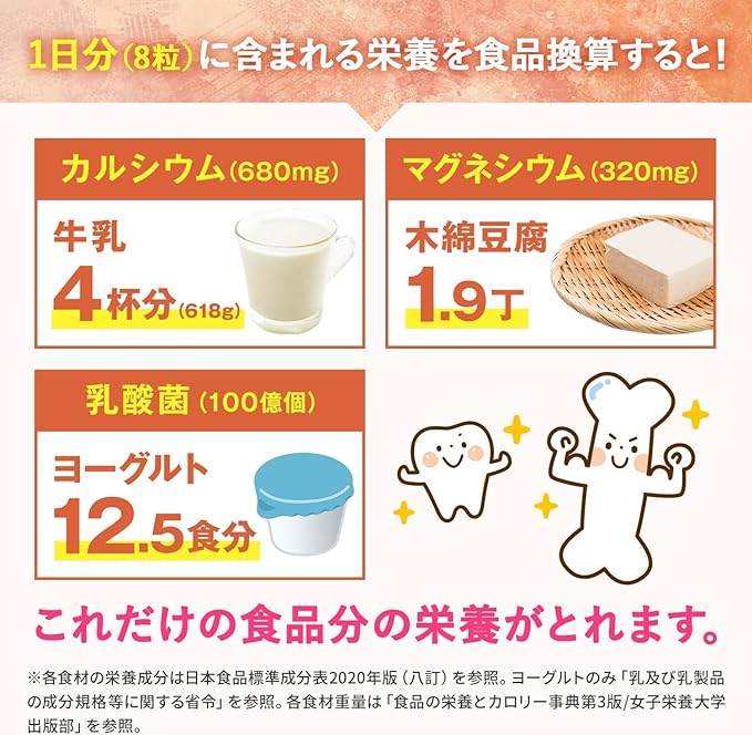 1 day's worth of calcium & magnesium Calcium 680mg Magnesium 320mg 10 billion lactic acid bacteria 240 tablets Nutrients necessary for bone and tooth formation Mango scent Supplements New Japan Health