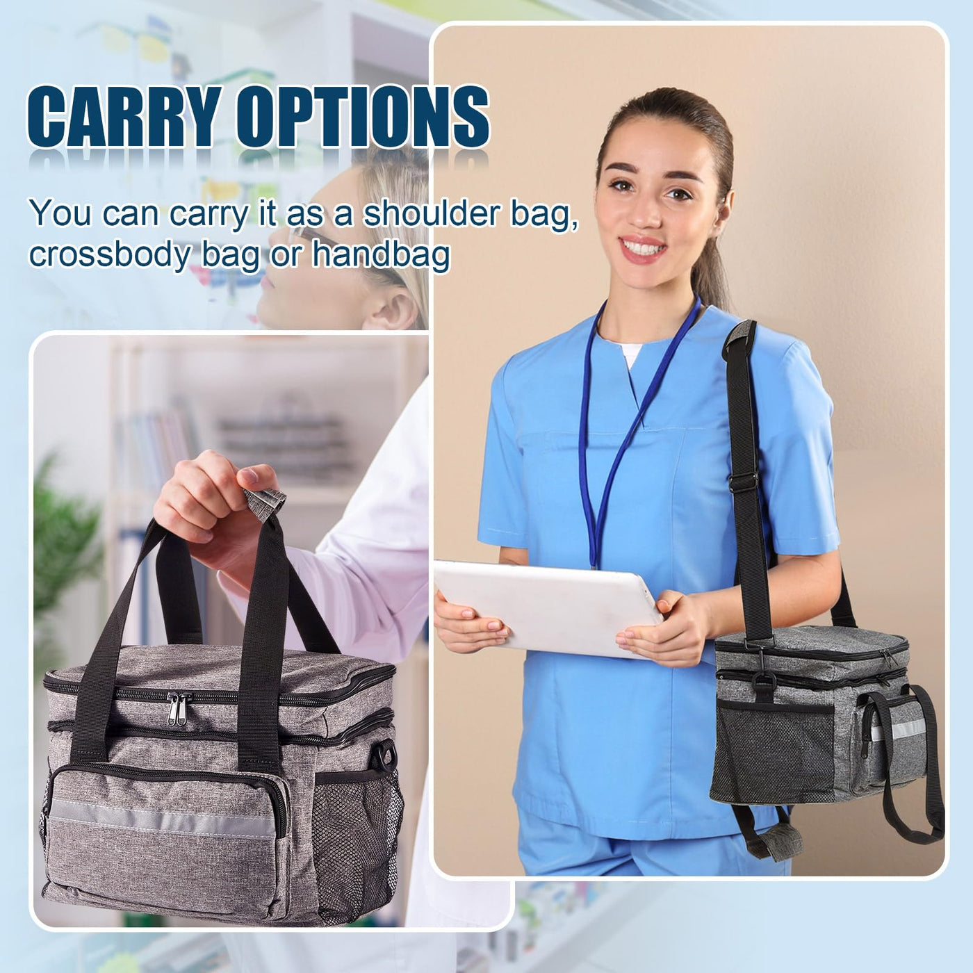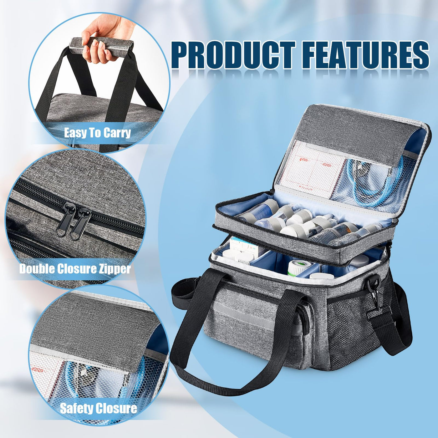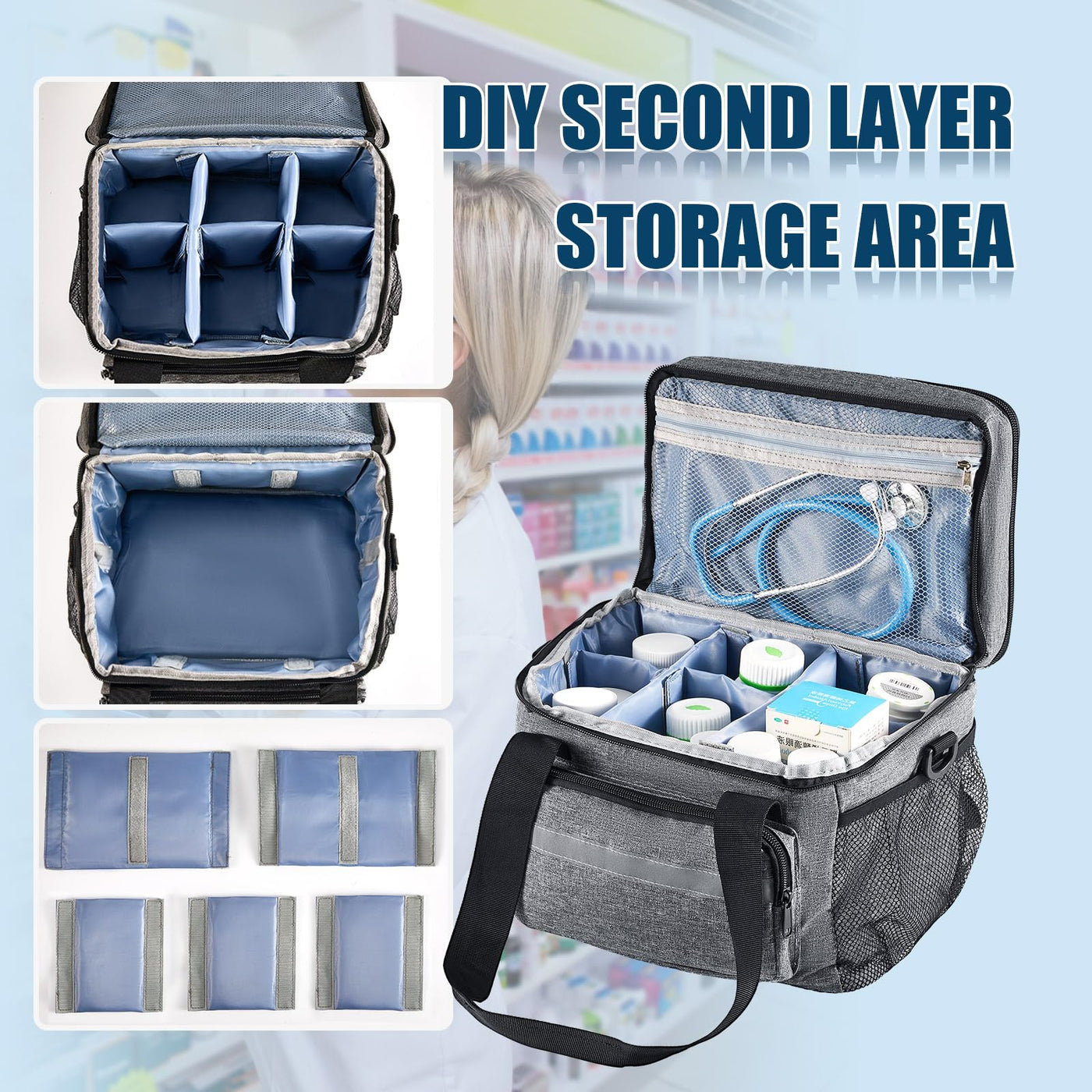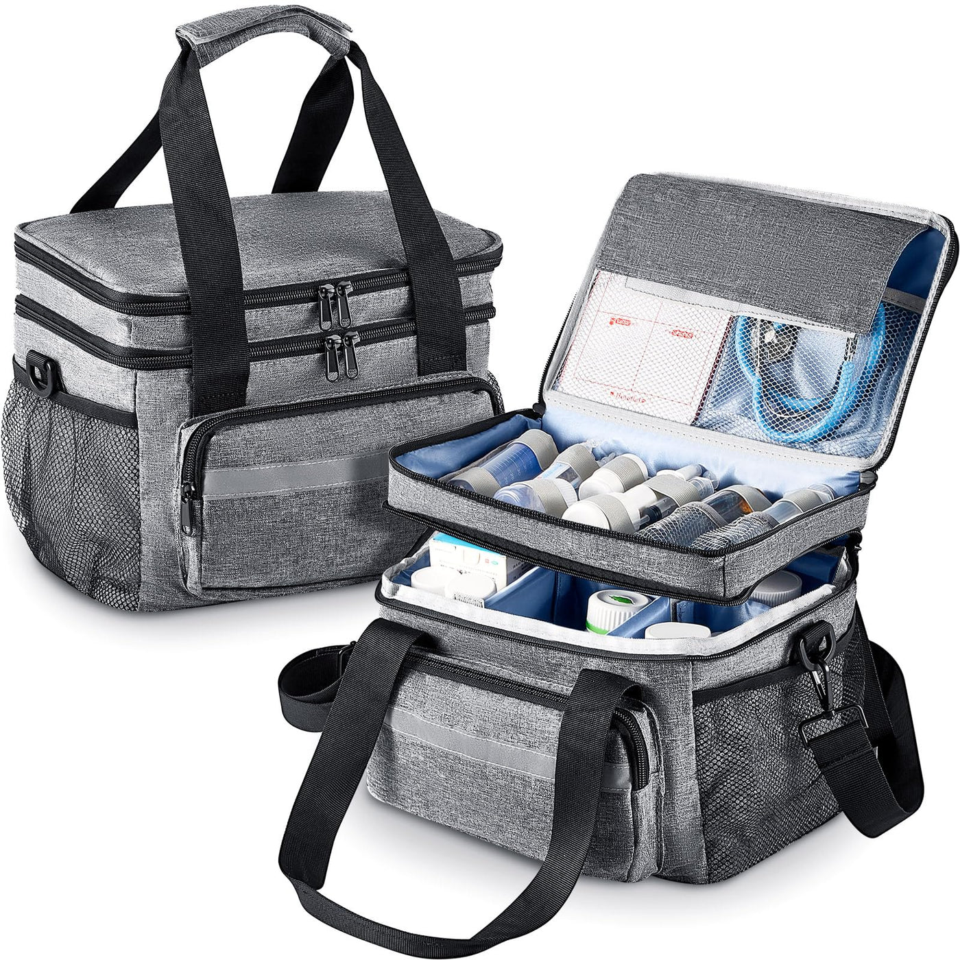 - Double Layer Design: top compartment organize medical supplies, such as stethoscopes; The first layer stores daily medicines, pills, tablets, woundplast, etc; The second layer stores medicine bottles, syrups, health products, pill cases, prescription bottles, supplements, etc.; Medical bag can cater to your medical storage containers needs
