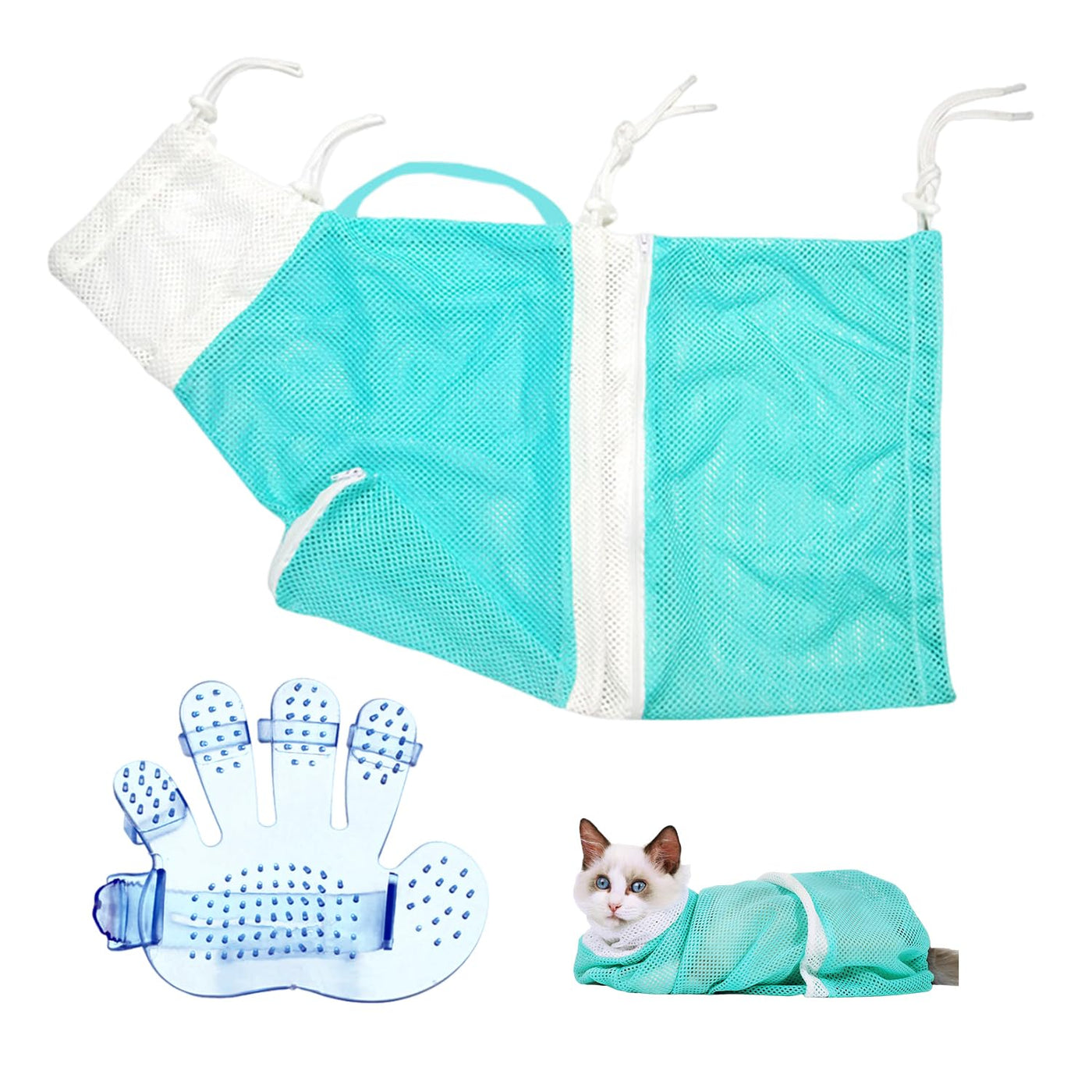 - [Practical Design] The cat bathing bag has an intimate design and is equipped with straps to make it easier to fix pets in the bag and prevent pets from escaping or being injured when bathing. The massage brush gloves are designed to be easy to use and help you massage and clean your pets easily.