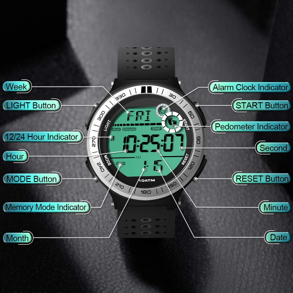 10 ATM Waterproof Sports Watch Pedometer for Men Boys Scuba Diving Watch with Lap Stopwatch and Alarm Clock Function, 12/24 Hour Format Selectable