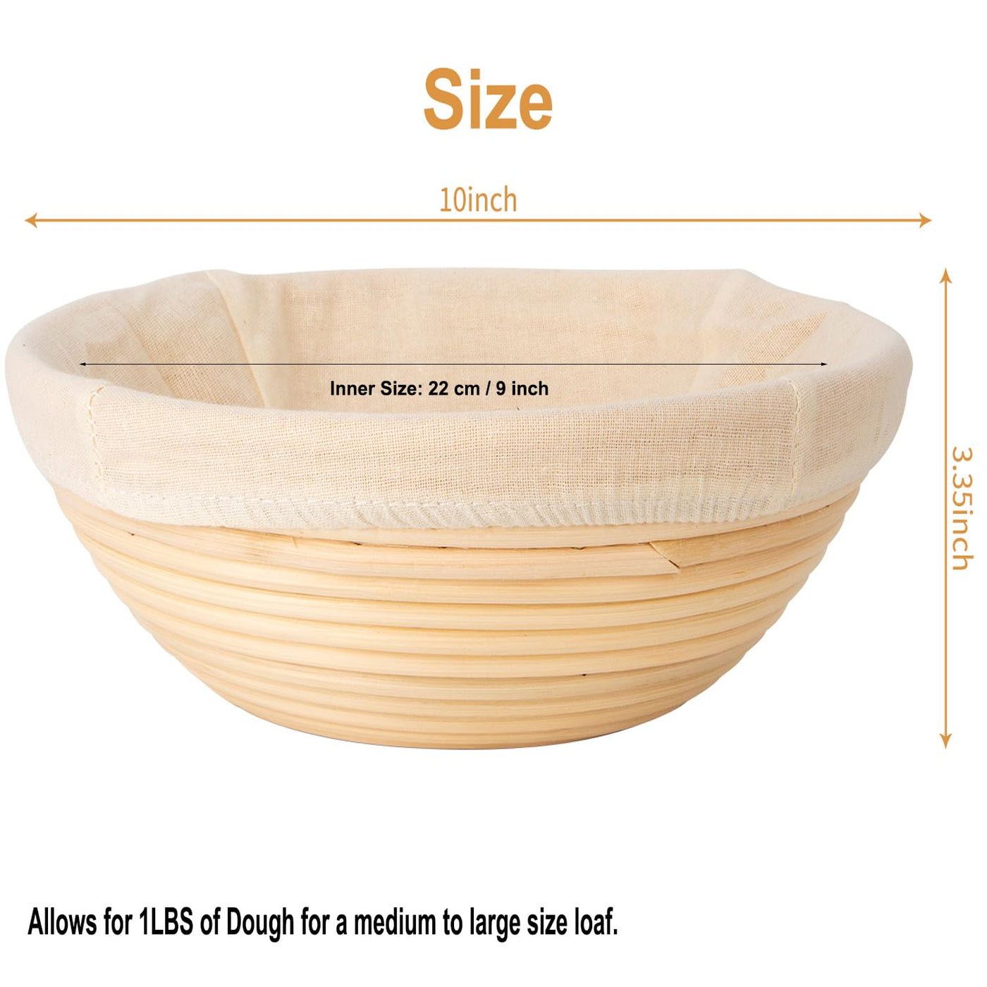 2PCS 9.8 inch Round Shaped Bread Dough Proofing Rattan Baskets with Liners Well Handmade Rattan Material, Our bread proofing basket is made from the highest quality natural rattan cane, free of harmful chemicals and materials. Enjoy baking with peace of mind knowing your breadbasket is safe for you and your loved ones. Easy to Cleaning, easy to clean and maintain, simply brush off excess flour and residue to keep it spotless. It's also lightweight and easy to carry, making it a convenient tool for all your baking adventures. Size:External Size: 9.84 in (L) 5.9 in (W) 3.15 in (H) size (about 2015077 mm) Packing Including: 2 x 9.8inch Bread Proofing Baskets + 2 Pcs Linen Liners How to Use this bread rising basket? Flour the brotform then place the kneaded dough in the basket until it rises. After dough has risen, take dough out of basket and transfer it onto a baking sheet for the oven. Please Remember that with dough many things effect the rise: Weather, yeast quality, and flour types can effect the rise. Many Great Bakers let the dough rise in a greased bowl before they put it in the brotform. This creates a better texture and crust of your European Country Bread. Ideal for the professional or the home baker looking for that professional finish to Artisan style breads. Once the loaf is removed, brush the inside of the basket out with a clean stiff brush and allow to air dry. Warm Tips: 1.Don't put the bread proofing basket into oven. 2.Keep the basket dry if you don't use it. 3.Easy to clean with warm water,do not need to use soap.