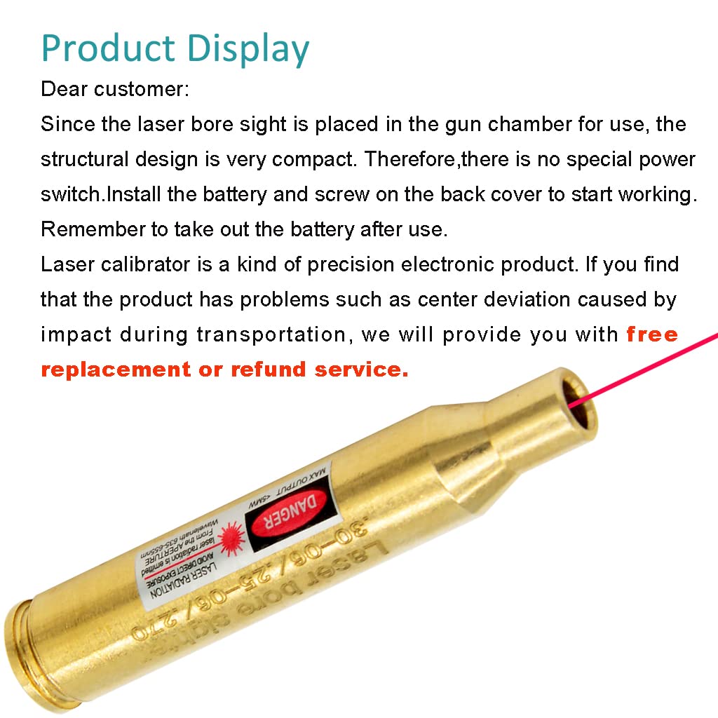 30-06/25-06/270 Laser Boresighter Product Advantages This laser boresighter is made of pure brass, fine workmanship, compact structure, fit for .30-06/ 25-06/270 caliber rifle.High precision laser sight 270, fast gun aiming correction and zeroing, without firing any ammo.Laser boresighter 30-06 comes with 2 sets of upgraded batteries. Greatly prolong the bore sighter's service life.Professional optical precision instrument factory manufacturing, strict and perfect quality control system to ensure the boresighter quality. How to use the .30-06 boresighter? 1.Set your rifile or other firearm in a gun vise or other stable platform. 2.Twist the end cap of the bore sighert by turning counter clockwise. 3.Insert the 3 batteries (+ side up)into the red dot laser boresighter. 4.Turn the end cap clockwise until it is slightly snug(now you can see the red laser). 5.Insert the boresighter 30-06 into the ampty rifle’s chamber and close the bolt. 6.Align your firearm so that the laser is centered on the bull’s-eyes. 7.Adjust your scope so that the reticle of the scope matches with the laser and bull’s-dyd alignment. 8.Remember to remove the boresighter before attempting to load your forearm with live ammunition. Read more Please note the following...... 1.This boresighter is completely designed according to the overall dimensions and specifications of 30-06/.270 gun caliber , and its structure is very compact. Therefore, there is no special power switch. It will start working after you install the battery. Since the positive pole of the button battery is in direct contact with the product shell, it is normal for the product to start working before you close the back cover. 2.This 30-06 laser bore sight is a precision part. If you find any quality problems caused by impact and collision during delivery, please apply for return and replacement immediately.We provide one month's unreasonable refund and three months' free replacement service. 3.Do not dry-fire your firearm while the boresighter is inserted.Doing so may cause damage to the boresighter. 4.Avoid direct eye exposure. Read more Material Composition Pure Brass Applicable Caliber .30-06/.25-06/.270 Caliber Laser Dot Colour Red Laser Wave length 635-665nm Range of the Sighting 15-100 yards Spot Size 2 inches at 100 yards Applicable Temperature Range -15℃ to 45℃ Max Output Power Less than 5mW Product Net Weight 25g Battery Model LR45/AG9/SR936 MOSANDON Laser Bore Sight 300WIN Boresighter MOSANDON Laser Bore Sight 9mm Boresighter MOSANDON Laser Bore Sight .223REM Boresighter MOSANDON Laser Bore Sight .308/.243 Boresighter MOSANDON Laser Bore Sight 8mm Boresighter MOSANDON Laser Bore Sight 7.62X39 Boresighter Caliber 300WIN Bore Sighter 9mm Bore Sighter .223REM Bore Sighter .308/.243 Bore Sighter 8mm Bore Sighter 7.62X39 Bore Sighter Material Composition Pure Brass Pure Brass Pure Brass Pure Brass Pure Brass Pure Brass Batteries Provided 6pcs(2sets) 8pcs(4sets) 6pcs(2sets) 6pcs(2sets) 6pcs(2sets) 6pcs(2sets) Colour of Laser Red Red Red Red Red Red Output Power <5mW <5mW <5mW <5mW <5mW Laser Class Class IIIA laser Class IIIA laser Class IIIA laser Class IIIA laser Class IIIA laser Class IIIA laser