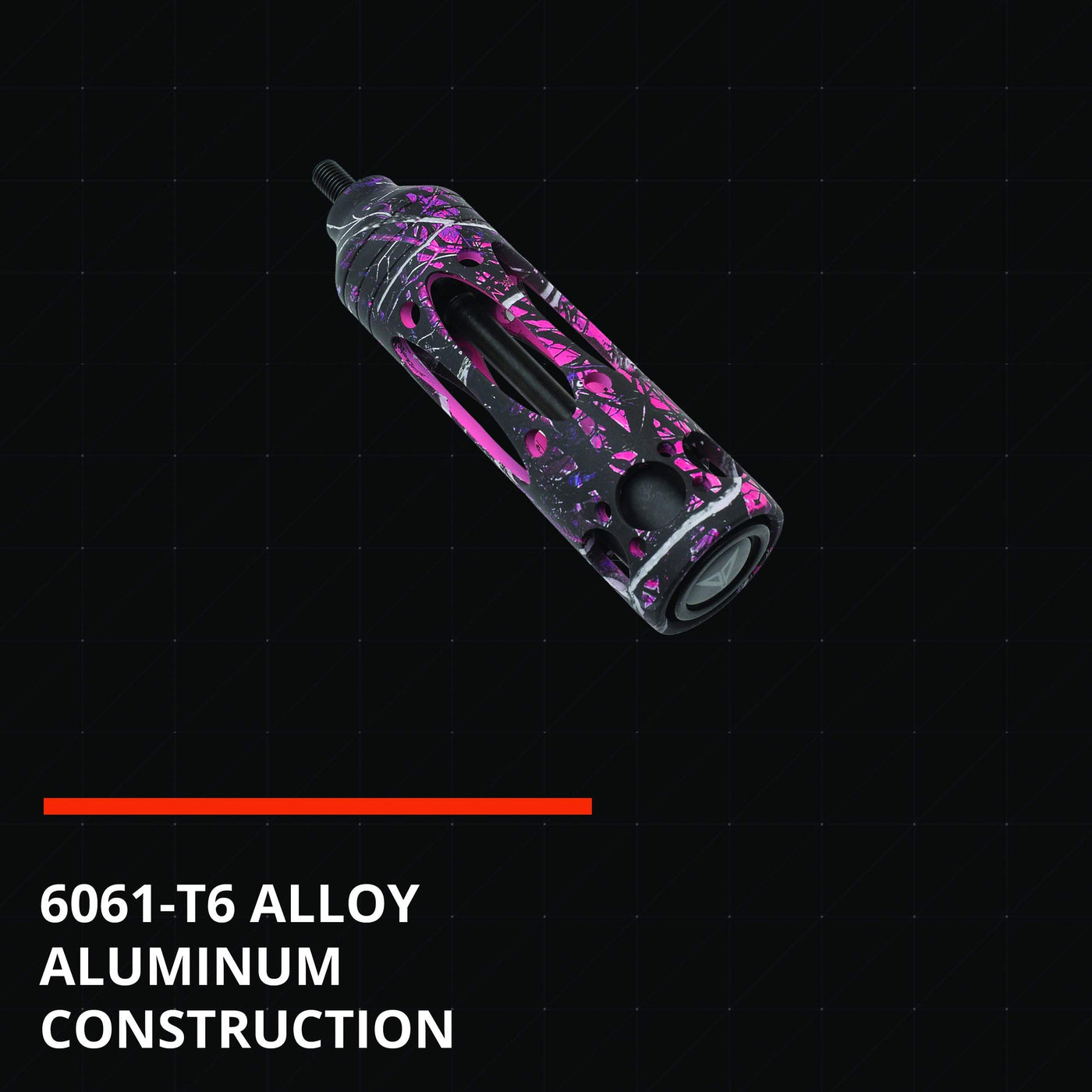 Stabilizer that features precision aluminum design, extreme vibration dampening, full-draw counter balance, hand tuned in the U.S.A., Weights: 5in.-6oz., 8in.-7oz., and 11in.-8oz.