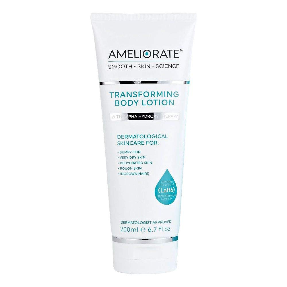 AMELIORATE Transforming Body Lotion is a UK first! A body lotion designed for Keratosis Pilaris that both exfoliates and moisturises.Optimum levels of Lactic Acid, a naturally occurring Alpha Hydroxy Acid, encourage the skin's natural exfoliation process, gently removing surface dead skin and debris whilst also stimulating the renewal of healthy skin cells.Clinically proven to significantly increase moisture levels in the skin for up to 12 hours.If irritation occurs discontinue use immediately. Avoid contact with eyes. If the product gets into eyes, rinse well with warm water immediately. This product contains an Alpha Hydroxy Acid (AHA) that may increase your skin’s sensitivity to the sun and particularly the possibility of sunburn. Use a sunscreen, wear protective clothing and limit sun exposure while using this product and for a week afterwards.INGREDIENTS: Aqua/Water/Eau, Lactic Acid, C12-15 Alkyl Benzoate, Glycerin, Prunus Amygdalus Dulcis (Sweet Almond) Oil, Ammonia, Ethylhexyl Palmitate, Cetearyl Alcohol, Glyceryl Stearate, PEG-100 Stearate, Dimethicone, Hydroxyethylcellulose, Phenoxyethanol, Cetearyl Glucoside, Xanthan Gum, Sodium Benzoate, Sodium Stearoyl Glutamate, Tocopheryl Acetate, Fragrance (Parfum), Potassium Sorbate, Pentylene Glycol, Hydrolyzed Milk Protein, Disodium EDTA, Serine, Sodium Lactate, Sorbitol, Urea, Linalool, Citronellol, Sodium Chloride, Citrus Aurantium Dulcis (Orange) Oil, Limonene, Coumarin, Juniperus Mexicana Oil, Alpha-Isomethyl Ionone, Allantoin, Pelargonium Graveolens Oil, Geraniol, CI 19140 (Yellow 5), CI 17200 (Red 33), CI 42090 (Blue 1).