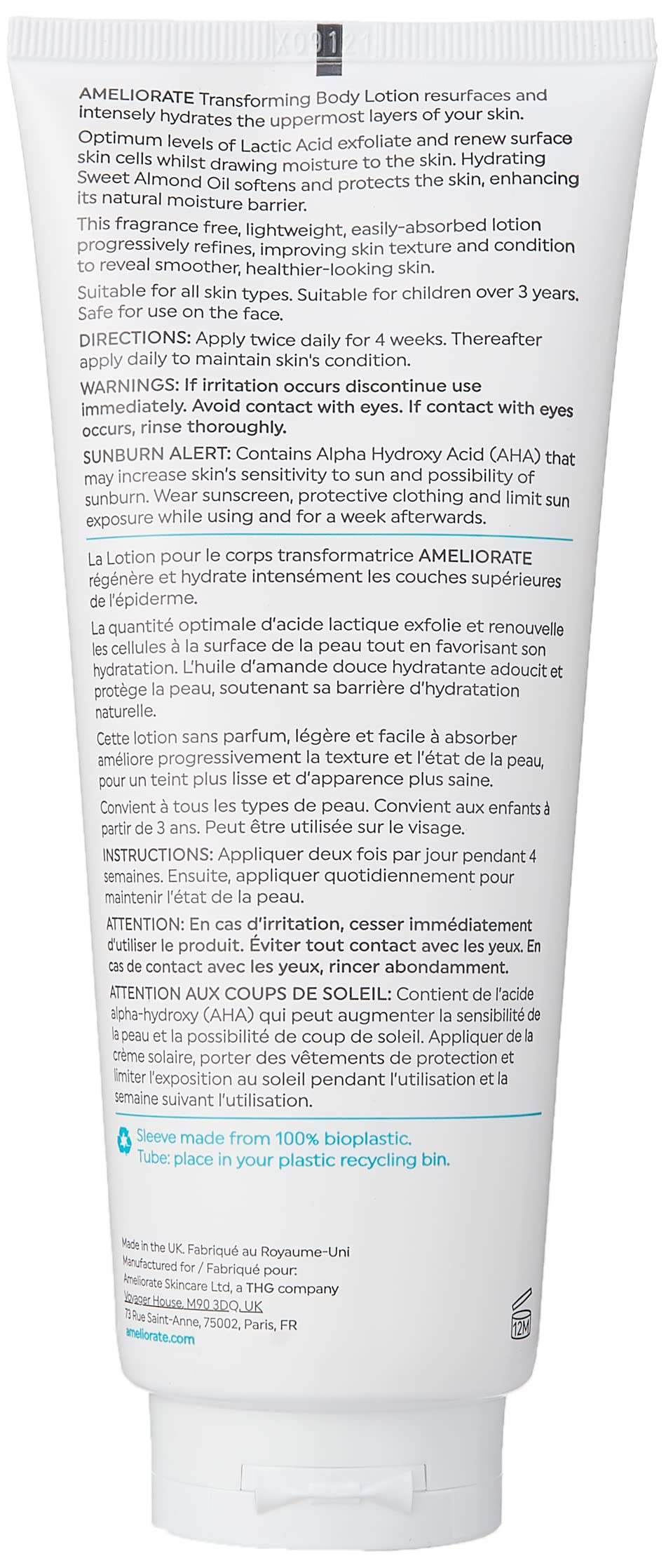 AMELIORATE Transforming Body Lotion resurfaces the uppermost layers of your skin.Optimum levels of Lactic Acid, a naturally occurring Alpha Hydroxy Acid, encourage the skin's natural exfoliation process, gently removing surface dead skin and debris whilst also stimulating the renewal of healthy skin cells.Together with our unique LaH6 Skin Hydration Complex, moisture levels are immediately replenished and significantly enhanced, providing instant comfort and a healthier look. This fragrance free, lightweight, easily- absorbed formulation is proven to work around-the-clock, progressively refining and improving skin texture and condition.Clinically proven to significantly increase moisture levels in the skin for up to 12 hours.If irritation occurs discontinue use immediately. Avoid contact with eyes. If the product gets into eyes, rinse well with warm water immediately.This product contains an Alpha Hydroxy Acid (AHA) that may increase your skin’s sensitivity to the sun and particularly the possibility of sunburn. Use a sunscreen, wear protective clothing and limit sun exposure while using this product and for a week afterwards.INGREDIENTS: Aqua/Water/Eau, Lactic Acid, C12-15 Alkyl Benzoate, Glycerin, Prunus Amygdalus Dulcis (Sweet Almond) Oil, Ammonia, Ethylhexyl Palmitate, Cetearyl Alcohol, Glyceryl Stearate, PEG-100 Stearate, Dimethicone, Hydroxyethylcellulose, Phenoxyethanol, Cetearyl Glucoside, Xanthan Gum, Sodium Benzoate, Sodium Stearoyl Glutamate, Tocopheryl Acetate (Vitamin E), Potassium Sorbate, Pentylene Glycol, Hydrolyzed Milk Protein, Disodium EDTA, Serine, Sodium Lactate, Sorbitol, Urea, Sodium Chloride, Allantoin. Sweet Almond Oil – A natural oil produced from almond kernels that protects the skin, keeping it soft and smooth.