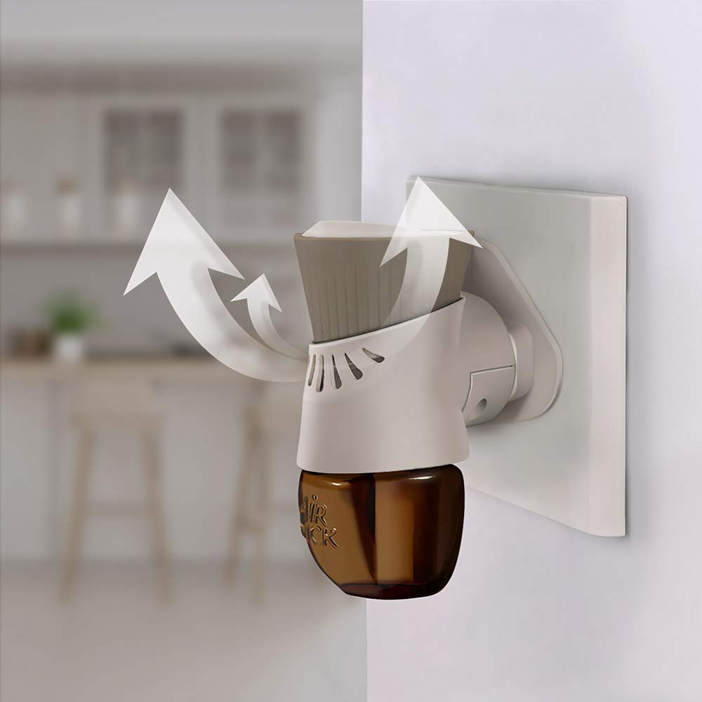 Use only with Airwick or Botanica by Airwick electrical plug diffuser 1. Remove the plastic cap from the fragrance bottle. 2. Firmly insert fragrance bottle into the underside of the plug diffuser unit, until a 'click' can be heard. Ensure the fragrance bottle is kept vertical at all times. 3. Plug the assembled unit into an available socket. 4. To increase or decrease the fragrance intensity, rotate the dial on the top of the diffuser. Largest mark = max setting 5. To replace the fragrance bottle, remove the device from the outlet and pull the bottle downwards READ SAFETY AND PRECAUTIONARY TEXT - RETAIN FOR FUTURE REFERENCE ALWAYS SWITCH OFF AT THE SOCKET BEFORE REMOVING OR INSERTING THE FRAGRANCE REFILL. DO NOT PLACE IN AN AREA WHERE THE DIFFUSER MAY BE SUSCEPTIBLE TO HARD KNOCKS. If unit becomes damaged, switch power off at the socket before removal. Do not use with extension cords or multi plug adapters. For indoor use only. KEEP IN AN UPRIGHT POSITION. Do not operate with wet hands or metal objects. Do not use continuously - switch off the socket overnight. Leave 50 cm of space above and around the diffuser during use. Do not obstruct or block air flow from unit. Do not use in small, confined pet areas without adequate ventilation. Do not place near a source of heat or direct sunlight. Do not place on polished, painted or plastic surfaces. To clean the appliance, unplug and use dry cloth. Use only as directed. USE ONLY AIR WICK REFILLS - THE USE OF OTHER REFILLS MAY GIVE RISE TO A TOXIC OR FIRE RISK.