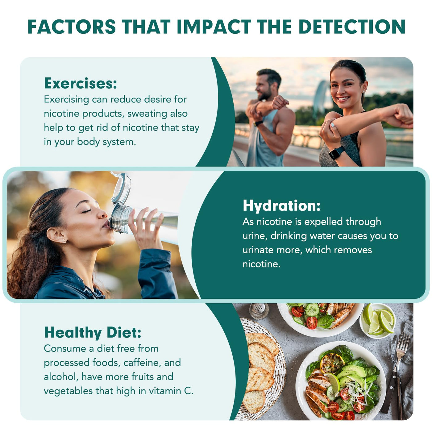 - 510(K) Cleared and CLIA Waived for OTC use; sensitive 200 ng/ml cutoff. Positive Results & the Detection Window (1) Cotinine may stay in the system longer for heavy and regular smokers who have a slower metabolic rate or whose kidney does not clean the nicotine out at a steady rate. (2) Smoke replacement therapy like Nicotine Gum, Nicotine Patch, and Nasal Spray that contain nicotine as well can elongate the positive detection time