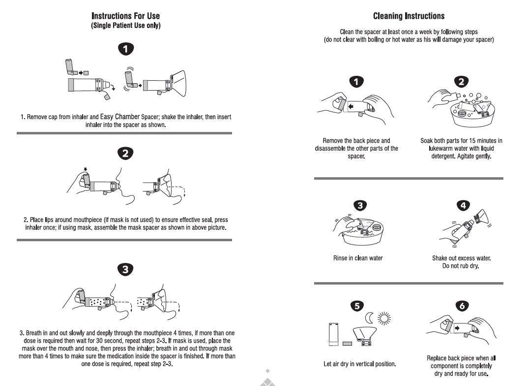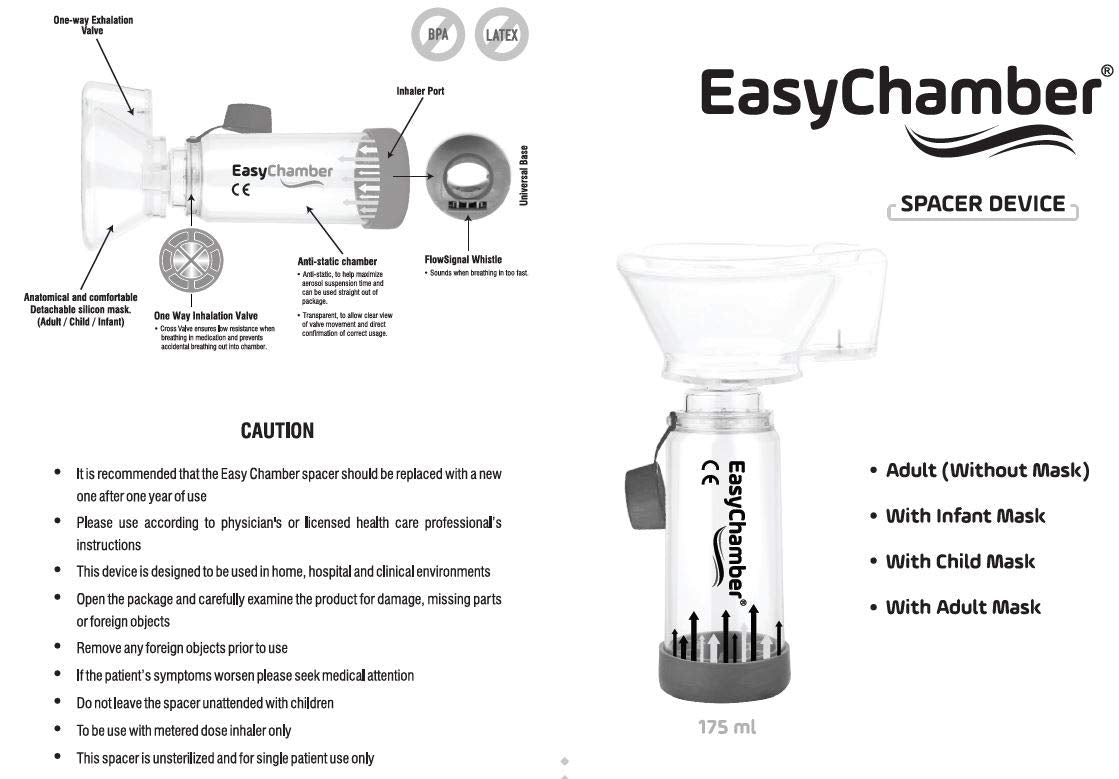 WHY EASYCHAMBER: Using a pMDI alone can be challenging, especially for children and the elderly. MDIs can spray medication up to100 km/h, causing medication to be deposited at the back of your throat or roof of your mouth. This can lead to side effects. Patient coordination can be difficult, especially during an asthma attack. Often, patients breathe in too quickly. EasyChamber space chamber can ensure optimal delivery of medication to the lungs in patients of all ages. EasyChamber traps and holds medication in suspension until you are ready to breathe in. Cross Valve ensures low resistance when breathing in medication and prevents accidental breathing out into chamber. It Delivers optimal dose of medication to lungs for action against asthma and COPD. Its FlowSignal whistle alerts fast inhalation.Its Universal base is compatible with most commonly prescribed pMDIs. Maintenance: Clean the spacer once a week. Do not clean with boiling or hot water as this will damage your spacer. Remove the mask and base, wash all the components in soapy water then rinse in clear water. Let air dry in vertical position. Do not wipe components with cloth. This will help retain its antistatic characteristics.