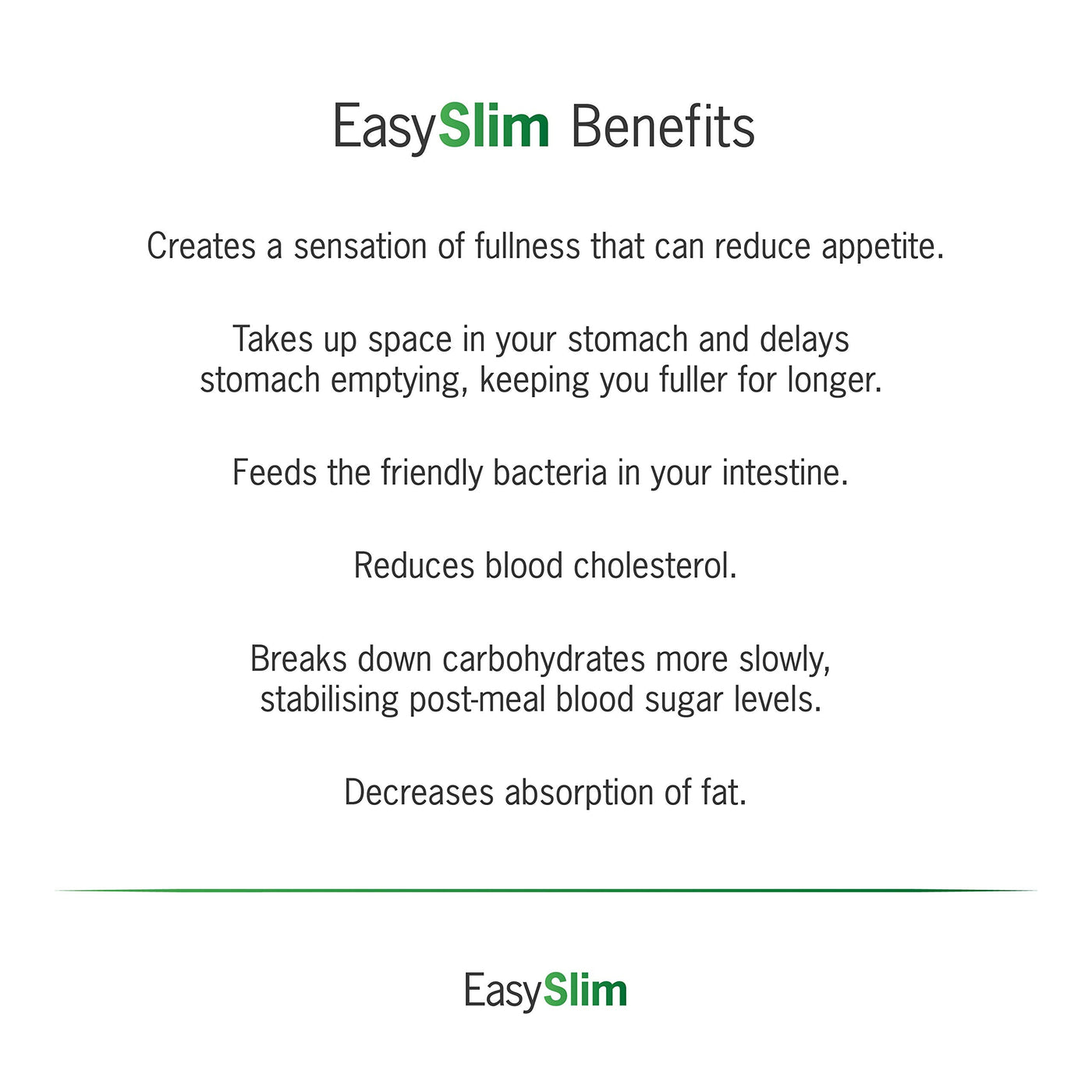Product description EasySlim is a weight loss support capsule containing Glucomannan (Konjac Fibre). Glucomannan in the context of an energy restricted diet contributes to weight loss. Each capsule in EasySlim contains 500mg of Glucomannan (Konjac Fibre) and 2 capsules should be taken 3 times a day, 30 minutes before a meal with 1-2 glasses of water. The beneficial effect is obtained with a daily intake of 3g of Glucomannan in three doses of 1g each, together with 1-2 glasses of water, before meals. What is Glucomannan (Konjac Fibre)? Glucomannan is a natural, water-soluble fibre derived from the roots of a south-east Asian plant called the Elephant Yam. Glucomannan has extraordinary water absorption capacities and is able to absorb 50 times its own weight in water! How Does Glucomannan Work and Support Weight Loss? To lose weight you need to eat less and exercise more, which is simple... in theory. But when you eat less food it’s hard to get enough fibre and when you don’t have enough fibre it leaves you feeling hungry, which means you want to eat more and this can be the downfall of many weight loss journeys. EasySlim contains Glucomannan which absorbs the water in your stomach and causes the Glucomannan to expand and bind to the water to form a gel. The expansion of Glucomannan takes up space in your stomach which helps you feel fuller for longer (without leaving you feeling gassy or bloated) and decreases your appetite. Benefits of Glucomannan (Konjac Fibre): - Creates a sensation of fullness that can reduce appetite - Takes up space in your stomach and delays stomach emptying, keeping you fuller for longer - Feeds the friendly bacteria in your intestine - Can help to reduce blood cholesterol - Breaks down carbohydrates more slowly, stabilising post-meal blood sugar levels - Decreases absorption of fat Ingredients Magnesium Stearate (Anti-Caking Agent), Size 0 Gelatin White Body and Cap Colorant: Body and Cap Titanium Dioxide (E171).