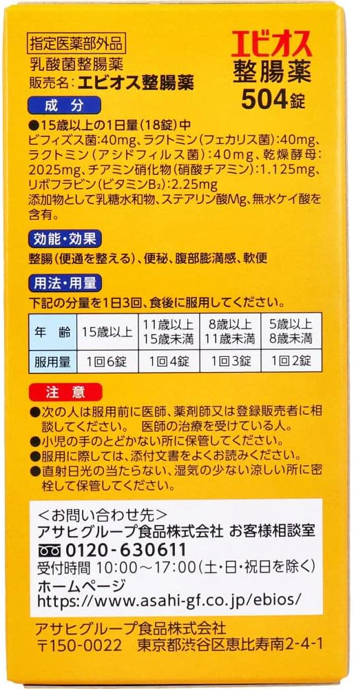 Dry yeast (natural ingredients + beer yeast) + 3 types of lactic acid bacteria improve bowel movements! Three types of lactic acid bacteria (Bifidobacteria, Faecalis, and Lactobacillus acidophilus) condition the intestines, and dried yeast is effective in promoting the growth of lactic acid bacteria. Dry yeast is dried beer yeast used for beer brewing, and contains nutritional components (vitamins B1, B2, B6, amino acids, nucleic acids, dietary fiber, etc.) necessary for the growth of lactic acid bacteria, and is useful for promoting the growth of lactic acid bacteria. Effective. ★Function of the ingredients contained in Ebios intestinal medicine. ●Three types of lactic acid bacteria exert an intestinal regulation effect. -Three types of lactic acid bacteria (Bifidobacteria, Bacillus faecalis, Bacillus acidophilus) maintain the intestinal environment. ★Bifidobacteria ・Always present from the lower part of the small intestine to the large intestine. - Produces lactic acid and acetic acid to improve intestinal regulation effects. ★Bacillus faecalis ・Mainly resides in the small intestine. - Rapidly multiplies and suppresses the growth of bad bacteria. ★Acidophilus - Lives mainly in the small intestine.・Creates lactic acid and adjusts disturbed intestinal flora. ●Dried yeast (brewer's yeast) is effective in promoting the growth of lactic acid bacteria. - Dry yeast (brewer's yeast) contains 9 types of vitamins (including vitamin-related compounds), 18 types of amino acids (including 9 types of essential amino acids), 9 types of minerals, and dietary fiber. - Dry yeast (brewer's yeast) contains nutritional components (vitamins B group, amino acids, nucleic acids, dietary fiber, etc.) necessary for the growth of lactic acid bacteria, and is effective in promoting the growth of lactic acid bacteria.