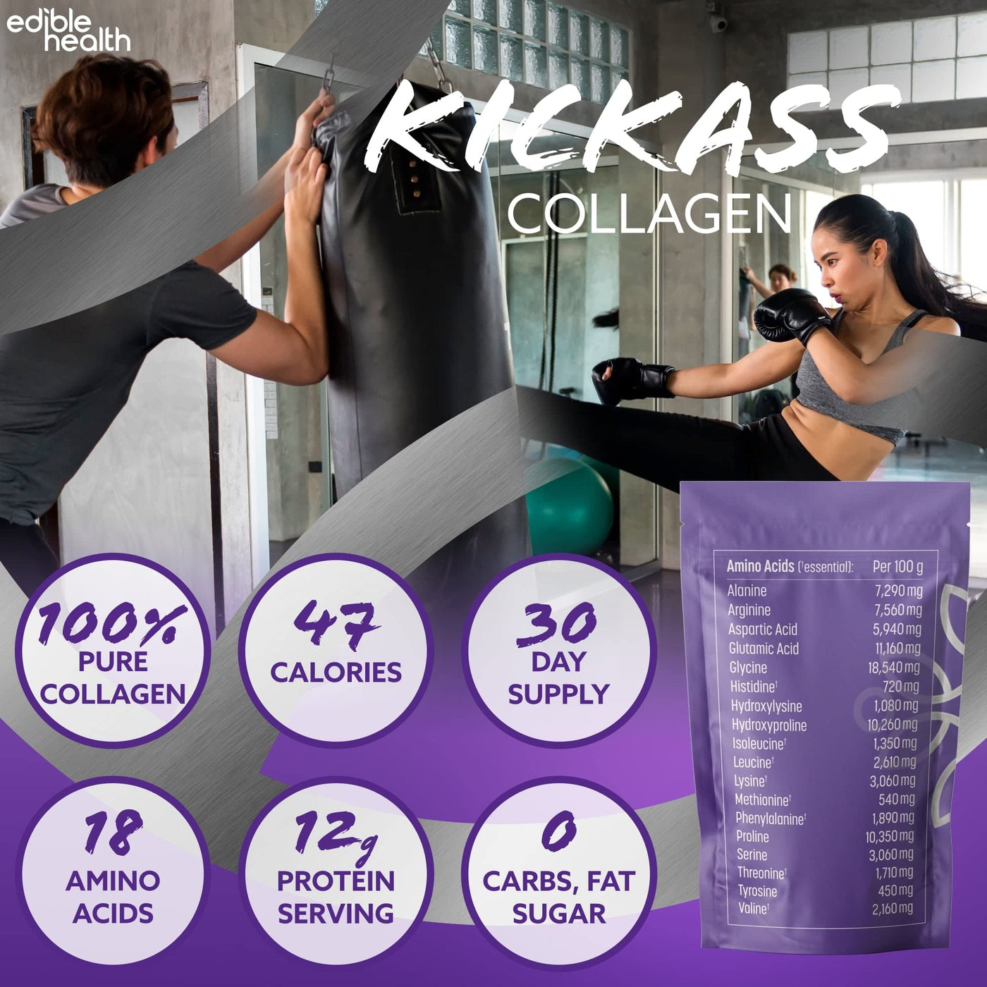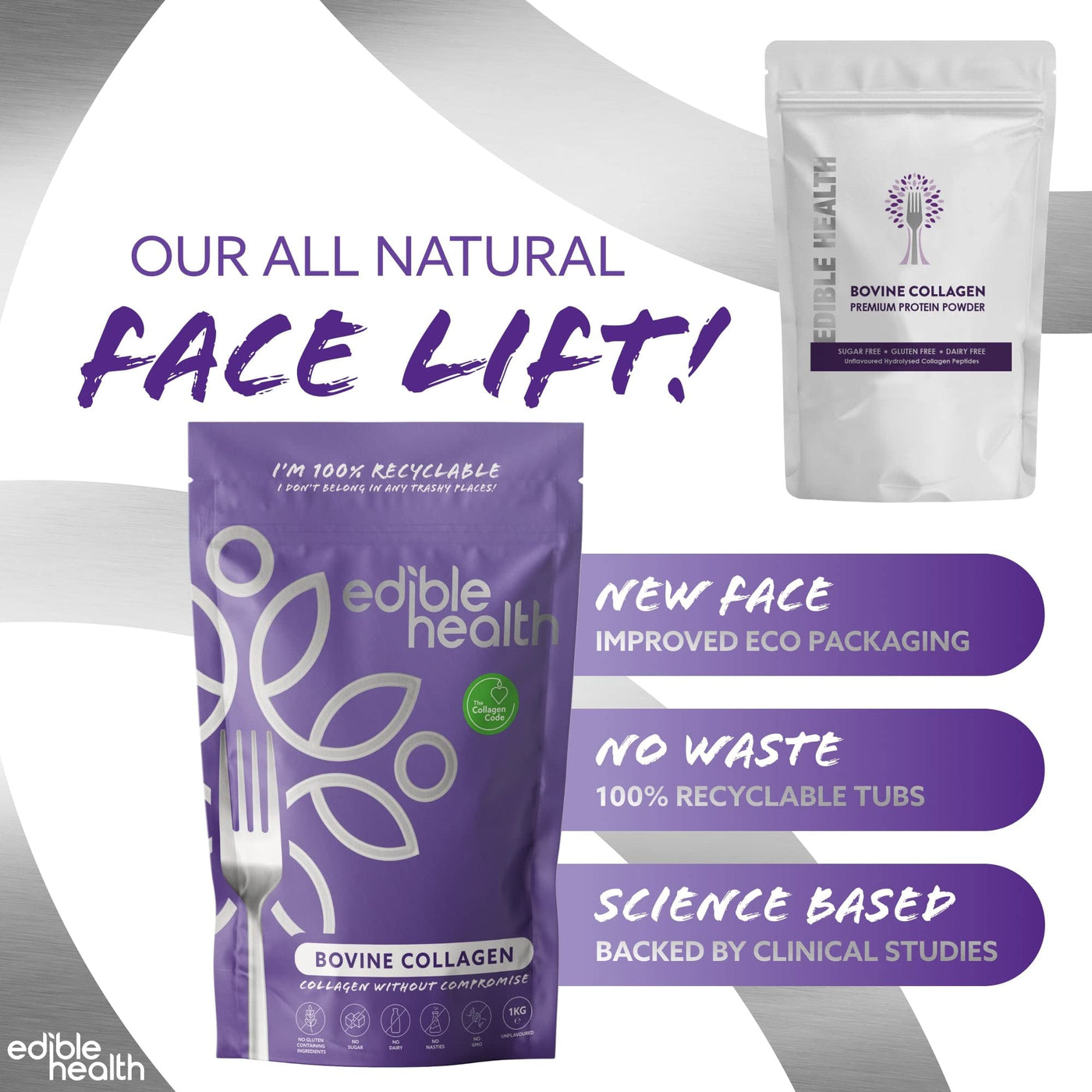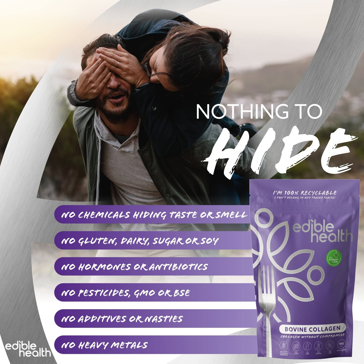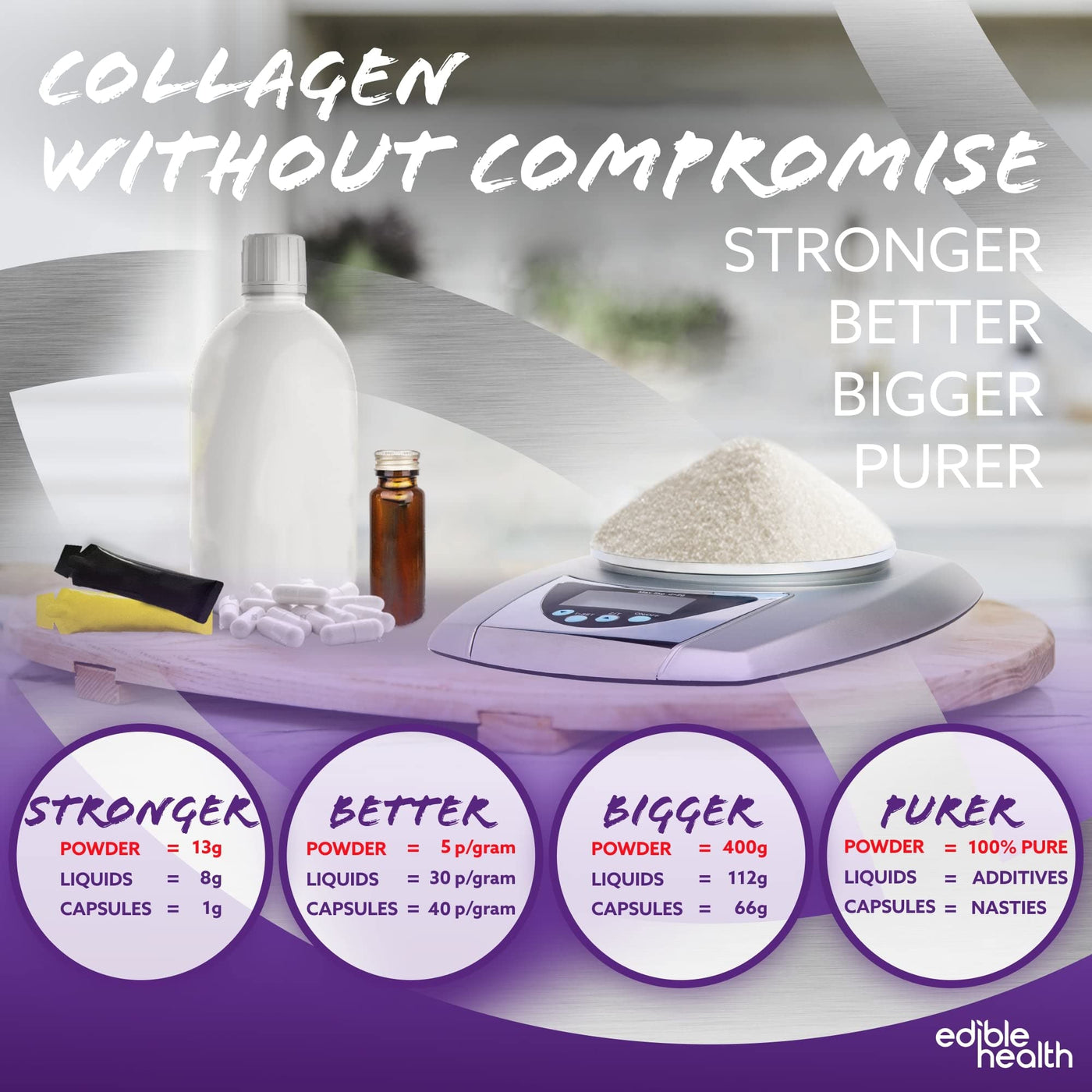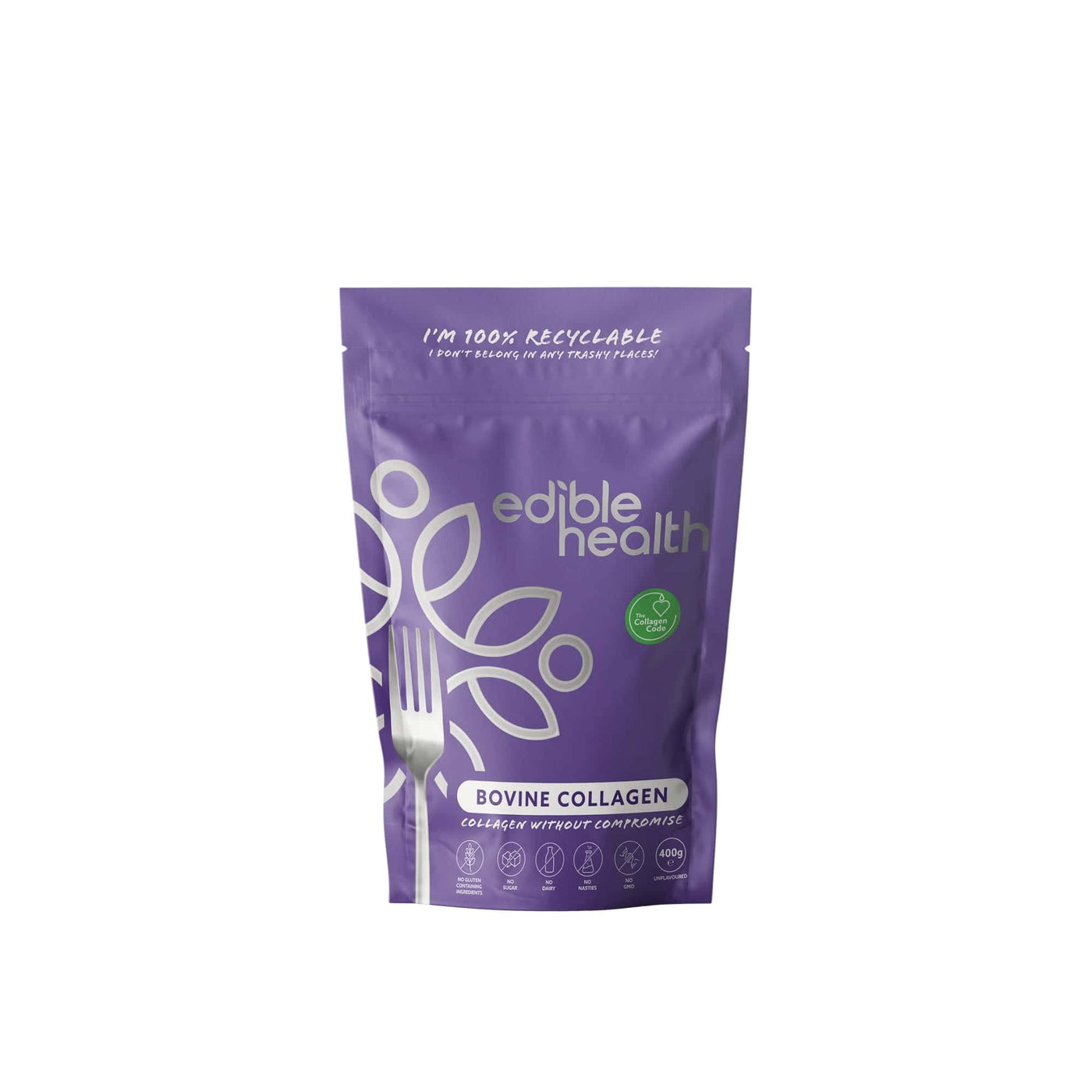Edible Health - Hydrolysed Bovine Collagen Powder - Types 1 and 3, Protein Peptides, 18 Amino Acids - Paleo, Keto, Kosher, Halal - UK & EU Certified Supplement - 400g Pouch, 30-Day Supply