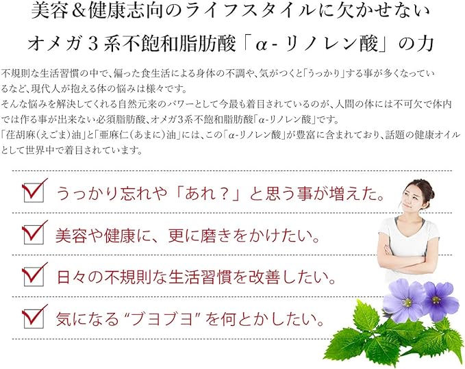 A hot topic of Omega 3 unsaturated fatty acid "α-linoleic acid" is an Ecru oil. Ezema oil is an oil extracted from the seeds of Egoma, which belongs to the Sisoaceae, and it has been noticed for its abundance of Omega 3 unsaturated fatty acid α-linoleic acid. α-linoleic acid is easy to oxidize, so we recommend taking it as fresh as possible for about a teaspoon a day or as a dresser without adding heat. This is a hot topic of Omega 3 unsaturated fatty acid, α-linoleic acid. Linseed oil is said to be the most abundant of plants, an omega-3 fatty acid, an oil produced by squeezing and extracting seeds of annual plants. Linseed oil is a heat-sensitive oil, so please put it in dressing, apply it on bread, or apply it to salad to get the effect well.