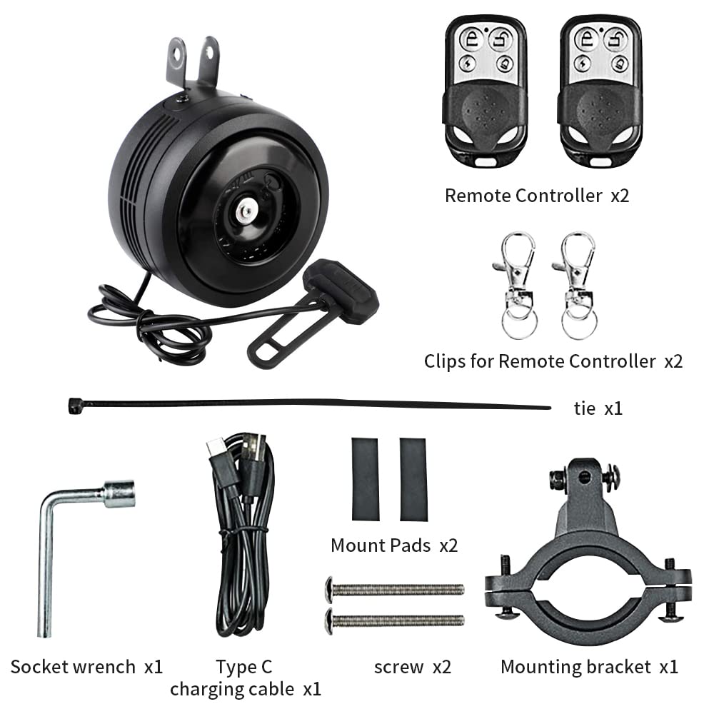 Electric Bike Bell Alarm Horn Waterproof with Remote Controller Anti-Theft Vibration Alarm Bike Horn with USB Rechargeable Function for Mountain Bike | Road Bicycle | Scooters etc
