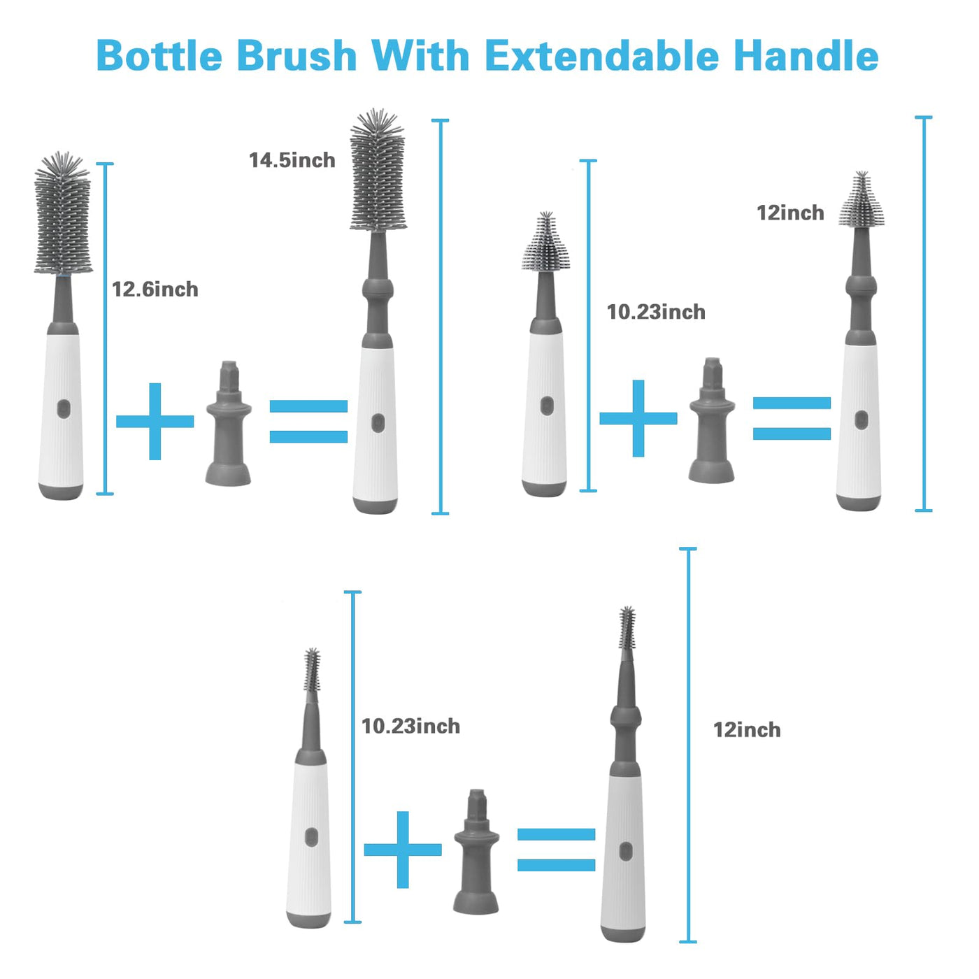 - Complete Cleaning AccessoriesBaby bottle cleaning kit includes large bottle brush, nipple brush, gap brush and straw cleaner brush,and also comes with an extension level, suitable for more bottle types.Lanyard and charging cable included aslo.