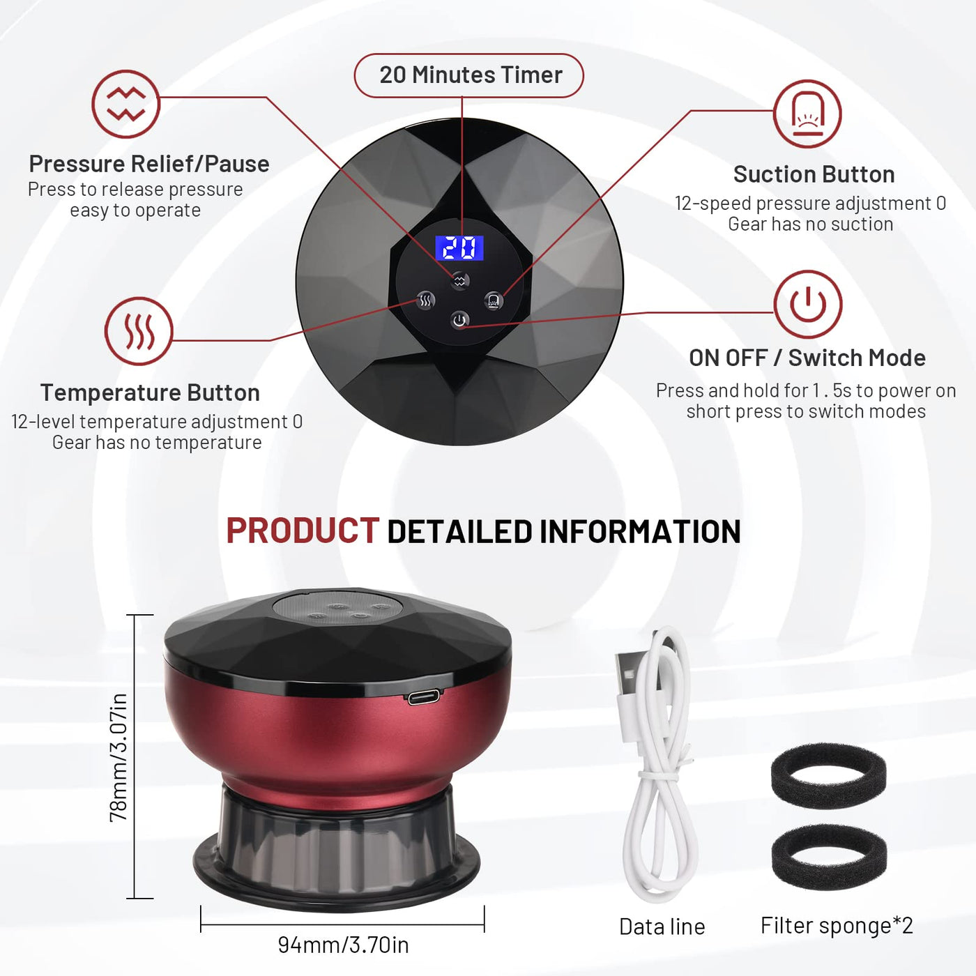 - 12 Levels Adjustable Suction ControlThis exquisite and lightweight massage vacuum therapy machine is equipped with 3 levels adjustable temperature, between 38-50C and 12 levels adjustable suction to help you relax and recover the way you want.