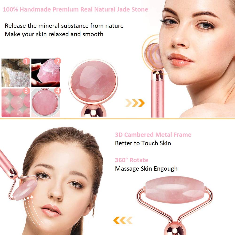 • NEW DESIGN: Our jade roller combines vibration technology with 100% natural rose quartz to increase the effect of your rollers and massagers. It combines the advantages of jade roller with electric facial massage roller. With it, your skin can absorb nature's mineral substance. Special shape design is also perfect for your eyes, nose and lips, reducing swelling and bags under the eyes.