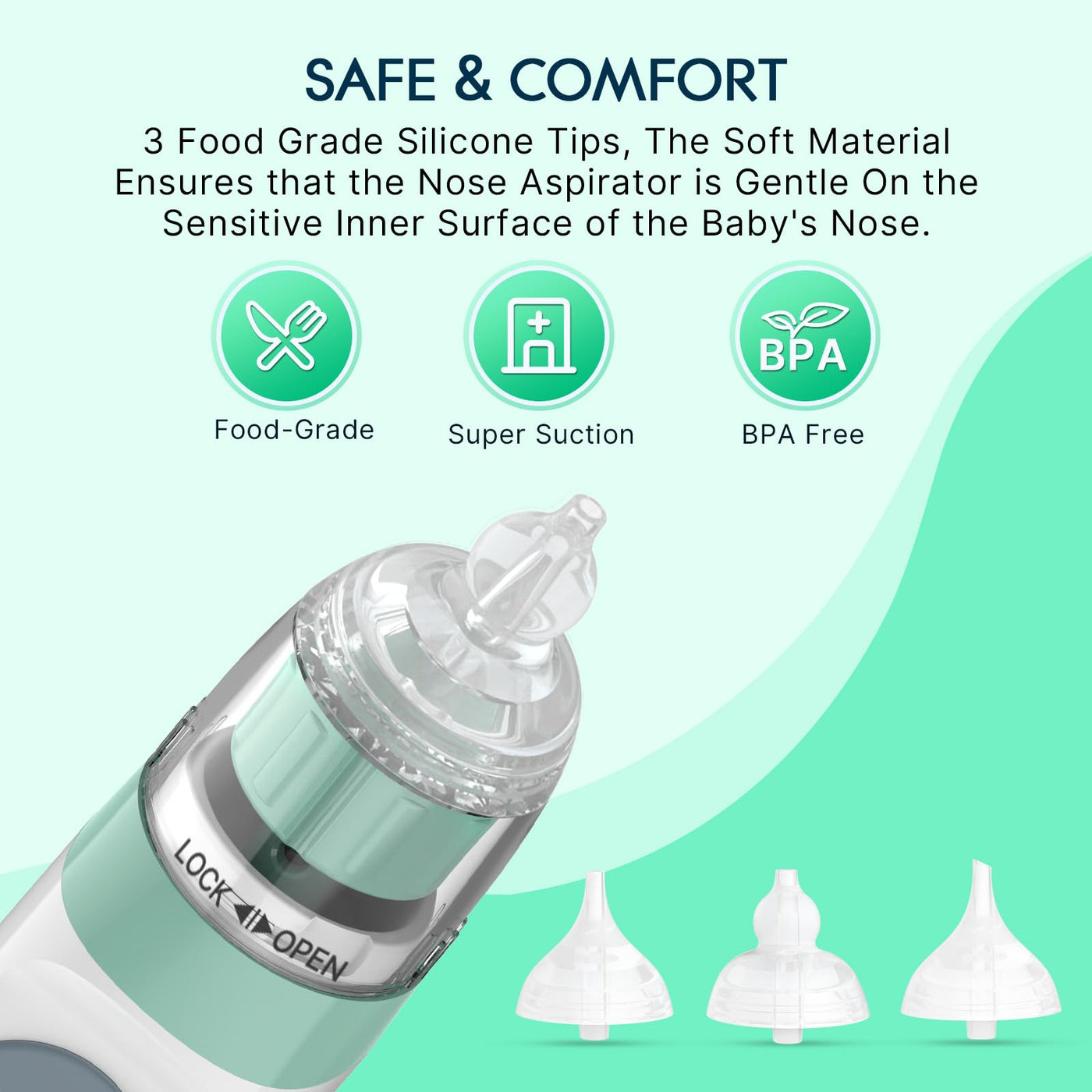 Electric Nasal Aspirator for Baby, Nose Aspirator for Toddlers, Waterproof Baby Nose Sucker, Nose Cleaner with 3 Silicone Tips, Adjustable Suction Level, Music and Light Soothing Function,Green Green