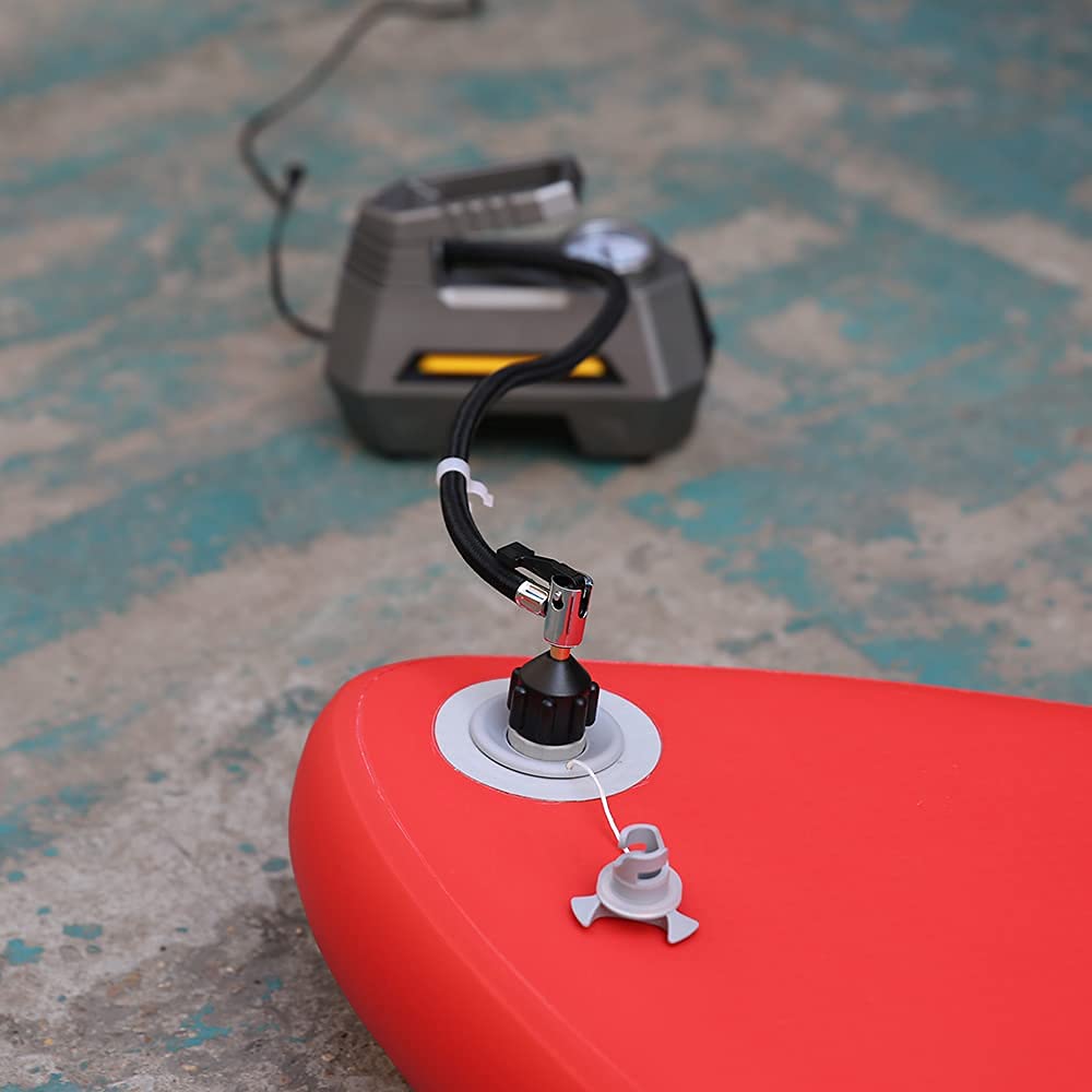 - SUP electric pump adaptor utilizes a standard Schrader valve fitting to couple with an air compressor or bike/tire pump.