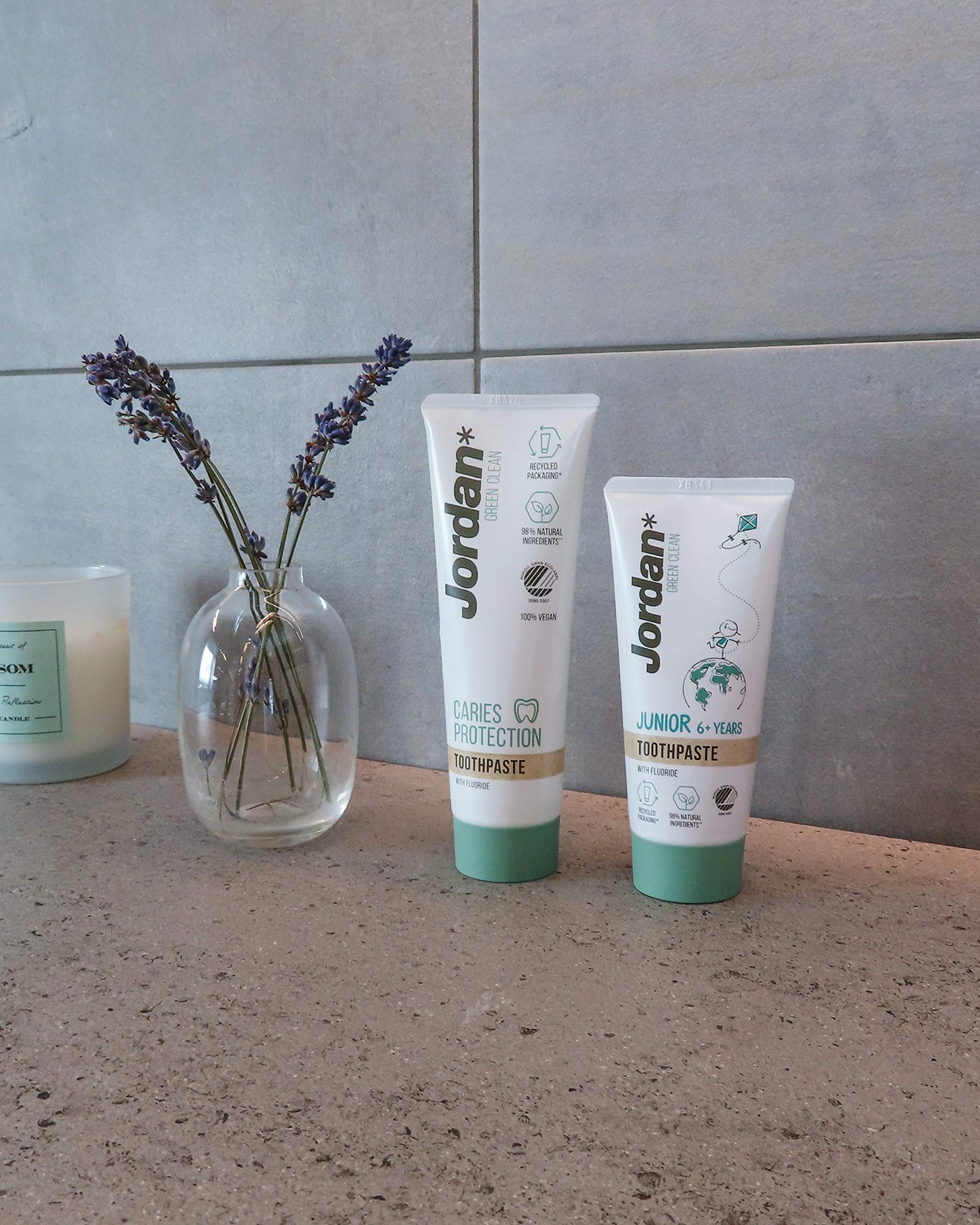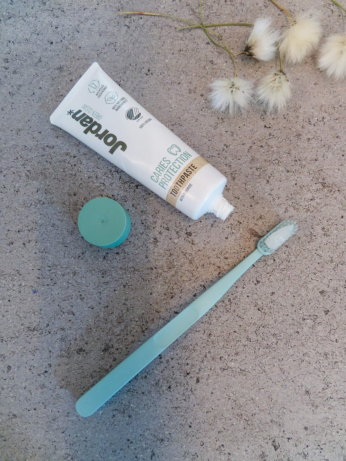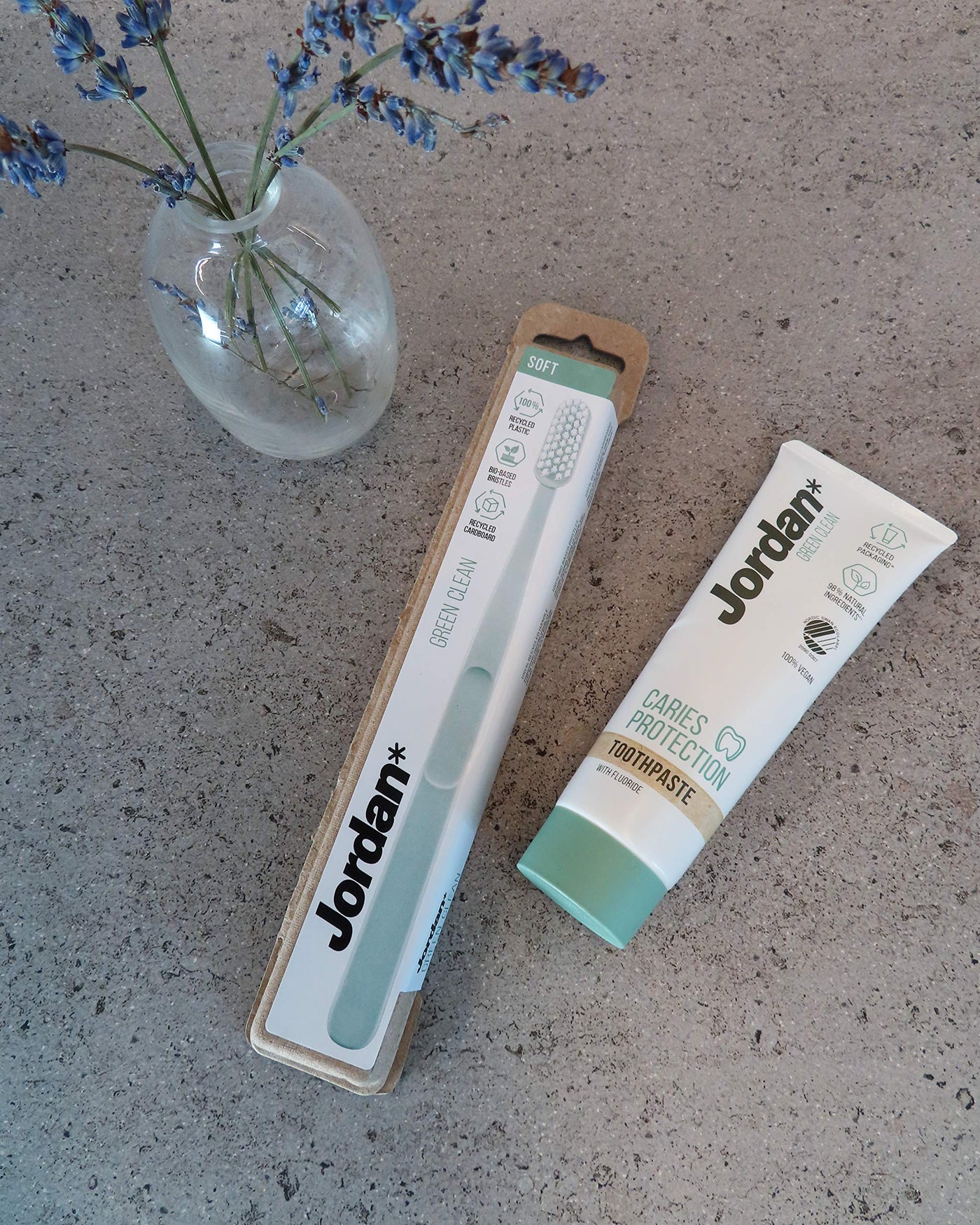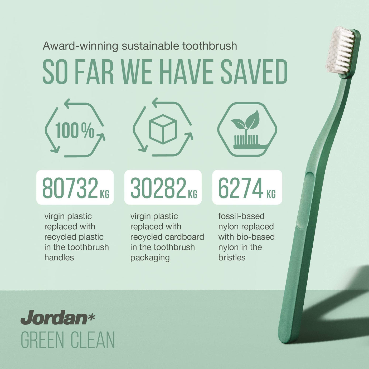- Designed with both you and the environment in mind : The Jordan Green Clean Toothbrush is made of recycled materials. The handle is made using 100% recycled plastic from e.g. yoghurt, margarine and food tubs while the remaining 10 % (the bristle) is 100 % bio-based