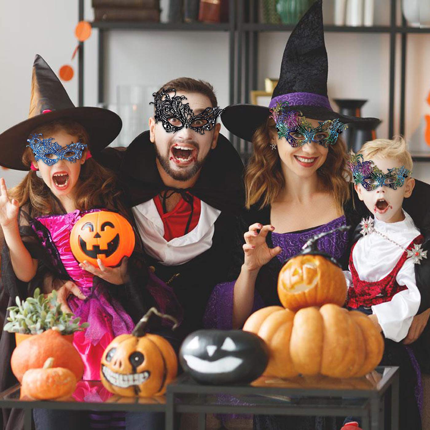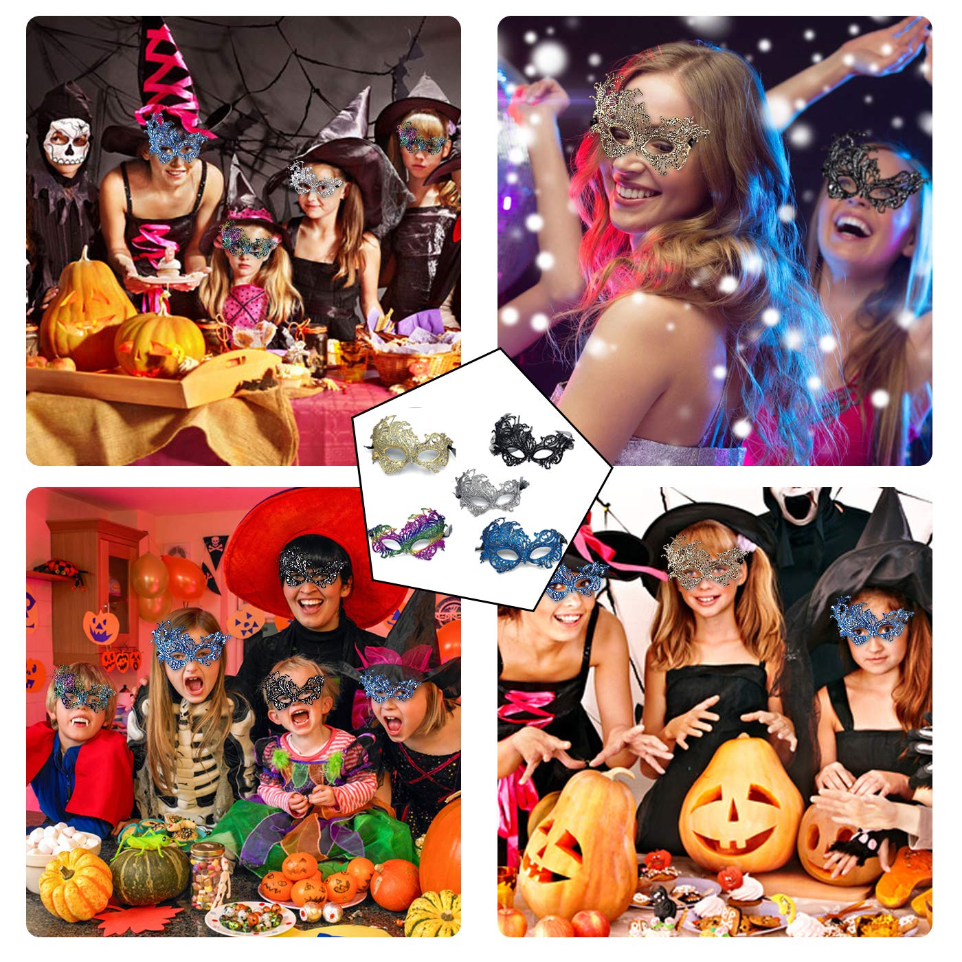 Lace Eye Mask - 5 color party props that fascinate adventurous couples. They are fun & oh-so beautiful! - The lace mask creates some mystery for the unforgettable Halloween and prepares for masquerades and parties. - The Venetian masquerade mask is made of fine materials, easy to use and suitable for everyone. Very suitable for Halloween, costume accessories, masquerade, carnival, birthday, dancing, taking pictures, etc. - Every girl has the dream of a princess, gorgeous dresses, exquisite masks, noble and mysterious gorgeous transformations, turned around to welcome the princess belongs to her, listen, the bell rang, and the party began. : - Product Name: Halloween lace mask - Specification: 5 PCS - Applicable Scene: Used for masquerade, Christmas, Halloween, masquerade, performance props, carnival, dance, etc. - Size: 9in Long, 5.5in Wide. - Color: Black silver blue gold colorful.