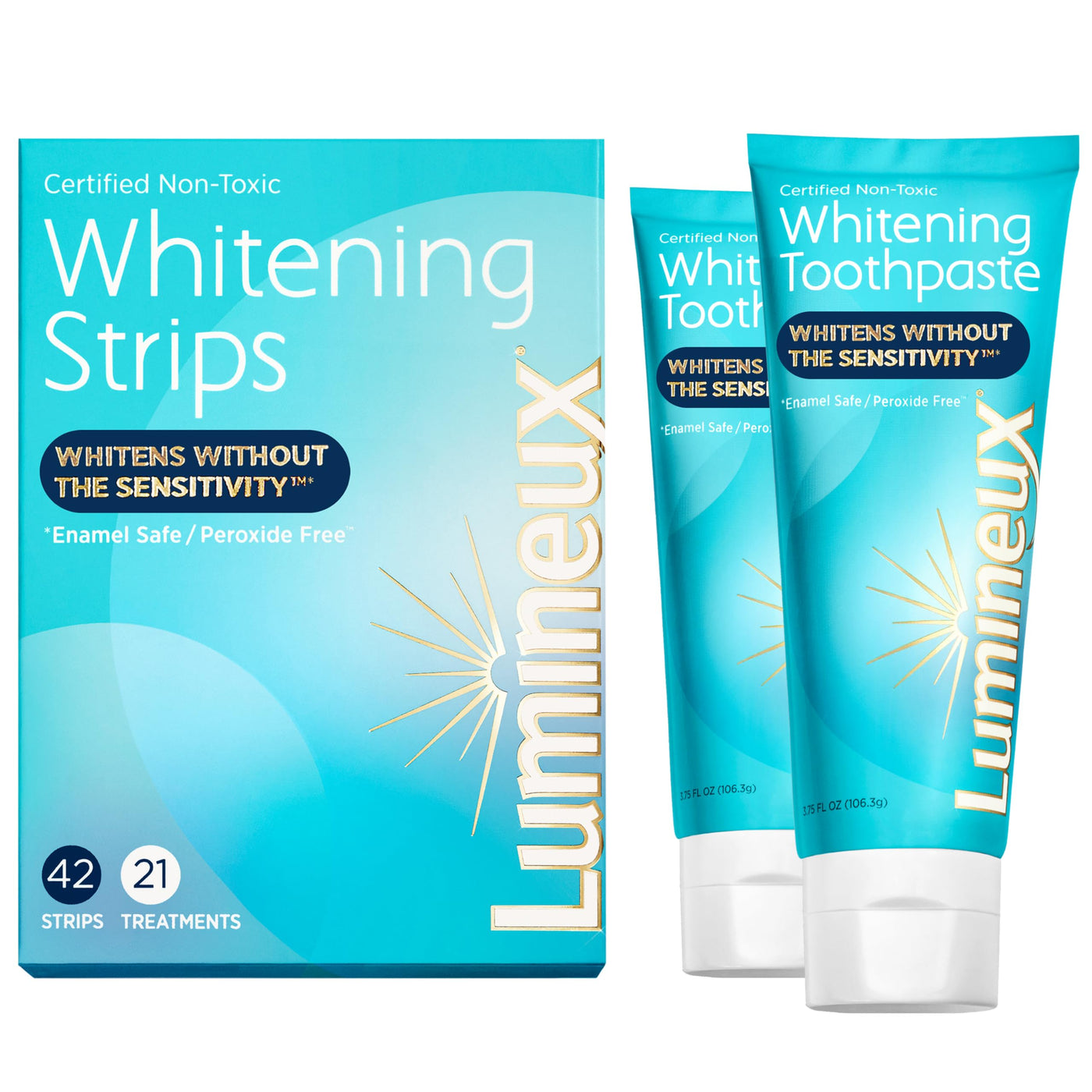 Lumineux Whitening Duo Set – Peroxide Free - Enamel Safe for Whiter Teeth – includes 21 Whitening Treatments & 2 Pack Whitening Toothpaste Certified Non-Toxic, Fluoride Free & Dentist Formulated