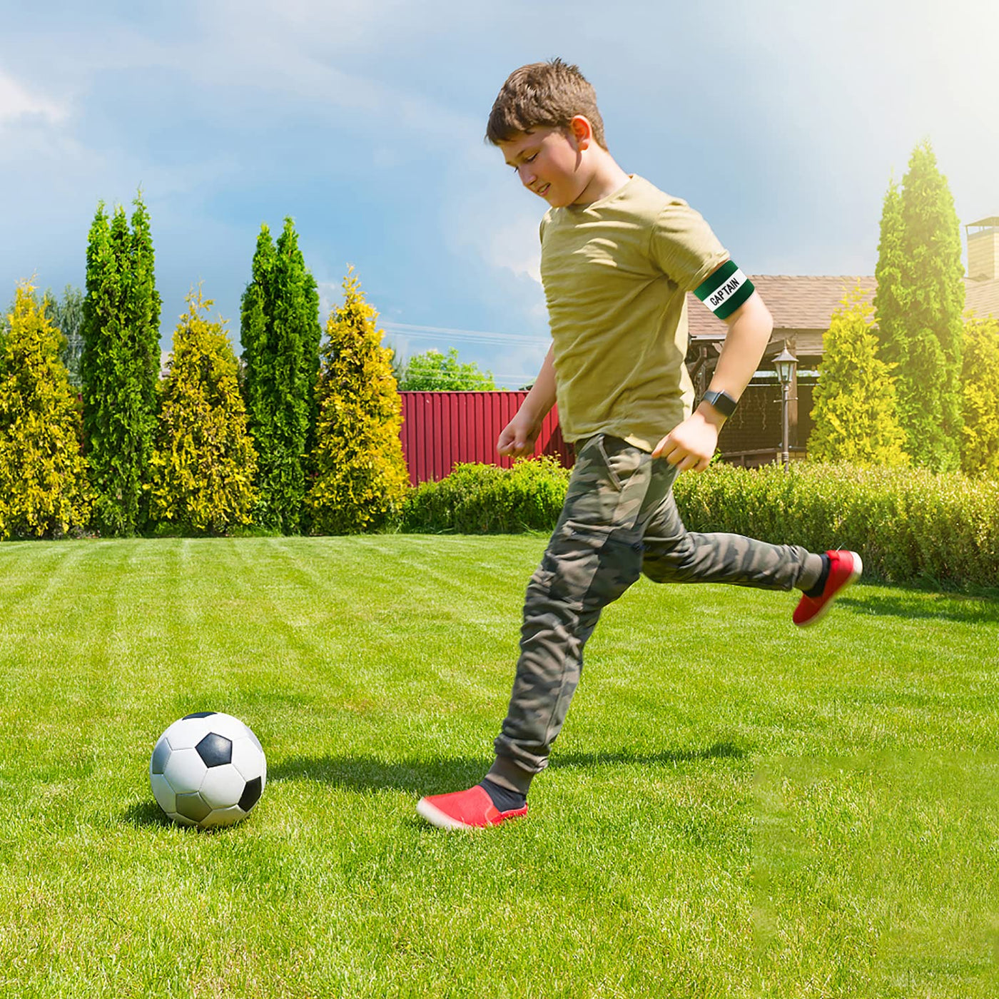 When you step onto the field, you're representing your team! Whether calling the coin toss in football, going for tipoff on the basketball court, or shaking hands in front of the soccer goals, set an example for sportsmanship and respect. This classic, elastic captain's armband should be a snug fit on most Adults and children, and will hold through tough play in rain, mud, indoor, and outdoor sports! Specification: Name: Soccer Captain's Armband Material: Elasticated fabric Size: One Size fit all Available colors: Red, Blue, Black, Yellow, Green. Closure: Velcro closure Design: Classic Captain Print Sports: Suitable for different sports Package included: 1 Unisex Captains Armband