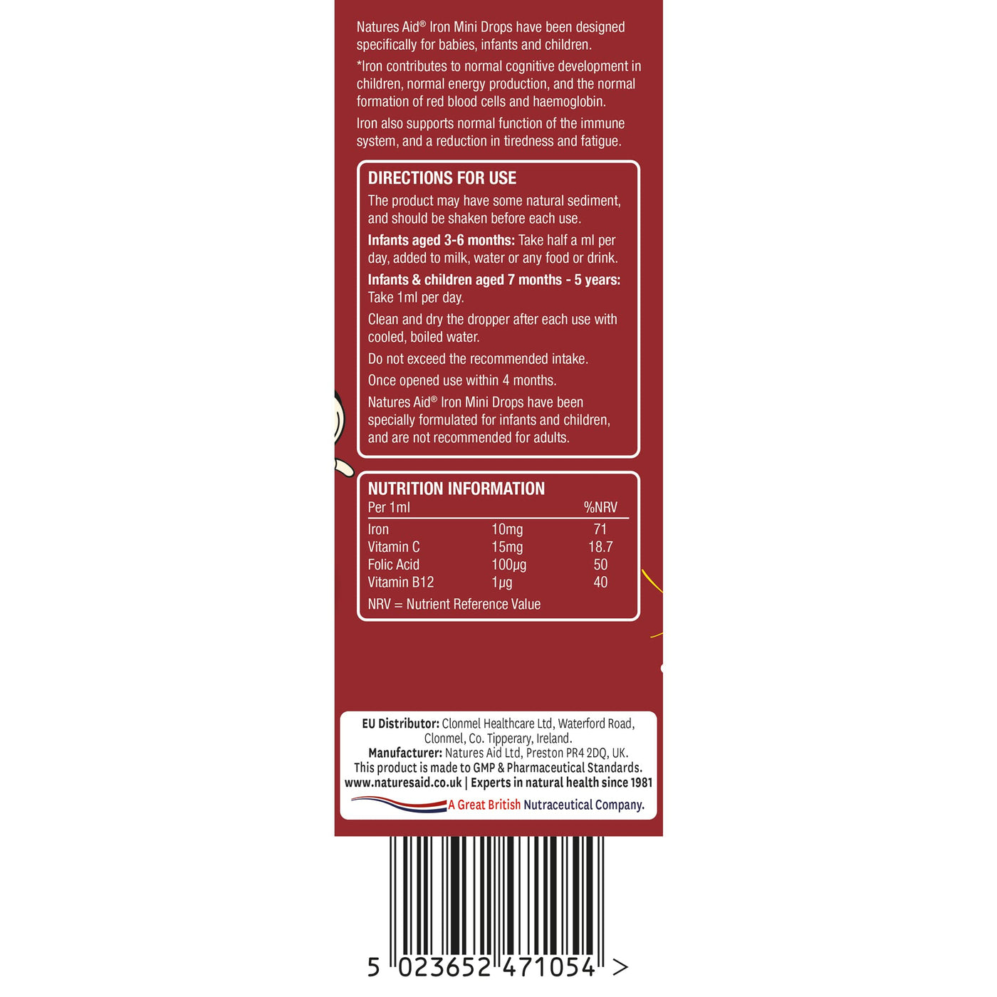 - Natures Aid Mini Drops Iron provides 10 mg iron daily, to support normal energy production and cognitive development in children