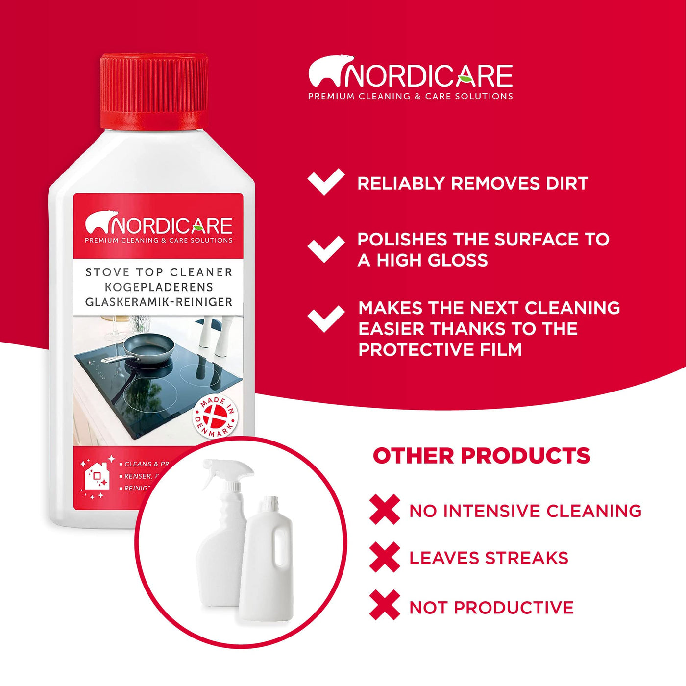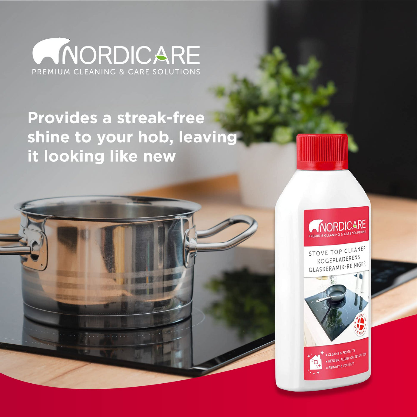 - ABOUT NORDICARE: 100% made in Denmark - for more than 100 years, Nordicare has been developing and producing its products in Denmark based on natural raw materials. The ceramic hob polish has been specially developed for effective and easy ceramic hob cleaning.
