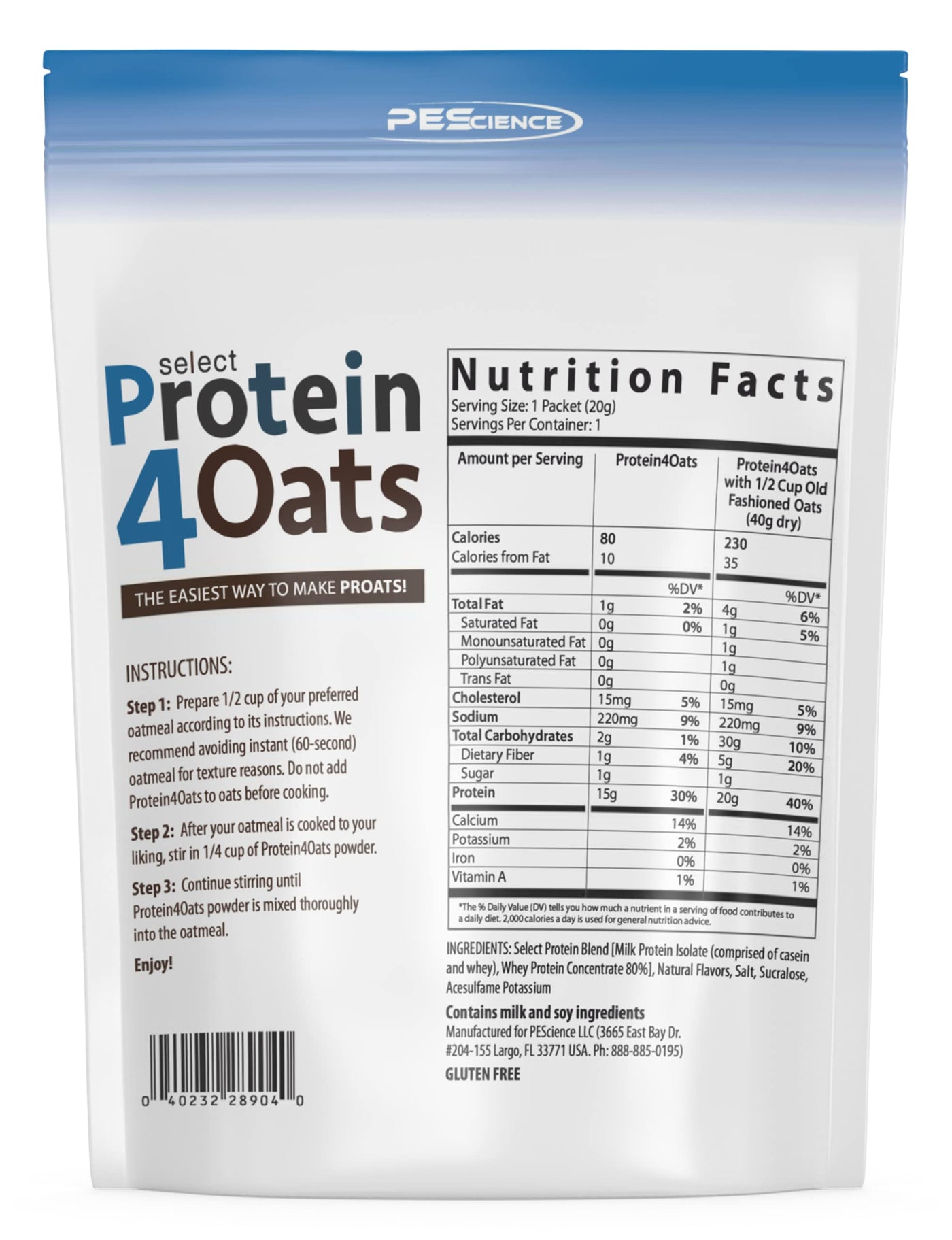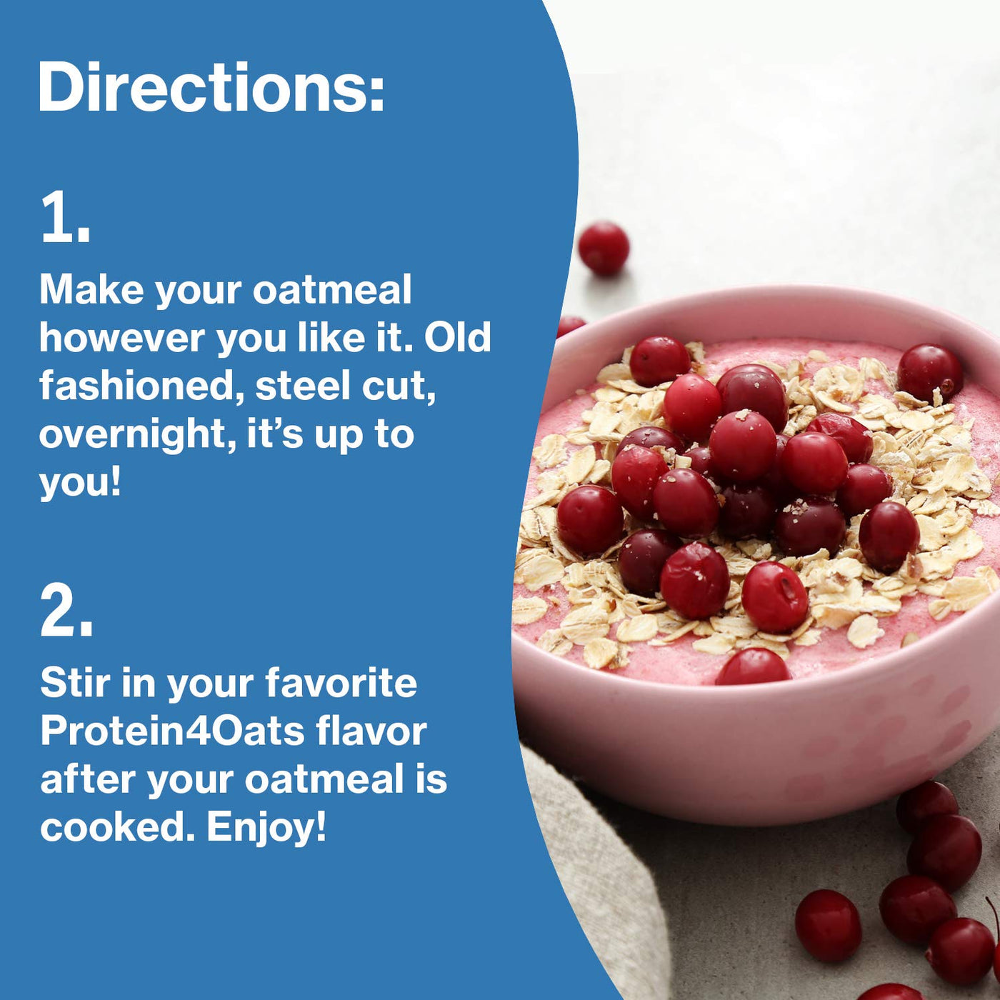 Protein4Oats is the perfect solution to a high protein breakfast. Oatmeal already makes for a great way to start your day. It's a quick, cheap, and nutritious whole grain. Ingredients Select Protein Blend [Milk Protein Isolate (comprised of casein and whey), Whey Protein Concentrate 80%], Natural Flavors, Salt, Sucralose, Acesulfame Potassium P.when('A').execute(function(A) { A.on('a:expander:toggle_description:toggle:collapse', function(data) { window.scroll(0, data.expander.$expander[0].offsetTop-100); }); }); Directions Instructions Step 1: Prepare 1/2 cup of your preferred oatmeal according to its instructions. We recommend avoiding instant (60-second) oatmeal for texture reasons. Do not add Protein 4 Oats to oats before cooking. Step 2: After your oatmeal is cooked to your liking, stir in 1/4 cup of Protein4 Oats powder. Step 3: Continue stirring until Protein4 Oats powder is mixed thoroughly into the oatmeal Manufacturer Contact Information PES See more