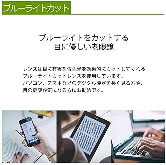 Renewed in 2021 to reflect customer feedback. 1. Adding non-slip rubber to the end of the temple improves stability when worn around the neck. 2. The lenses are safe even when used with a mask and have an anti-fog coating. Add. These are senior glasses and reading glasses that are extremely comfortable to use with high specifications such as 3. Blue light cut lenses, 4. Elastic shape memory TR90, and 5. Lightweight polycarbonate.