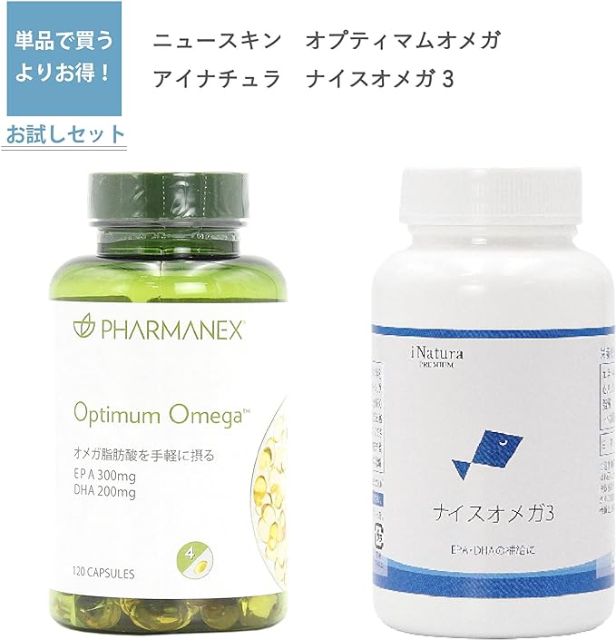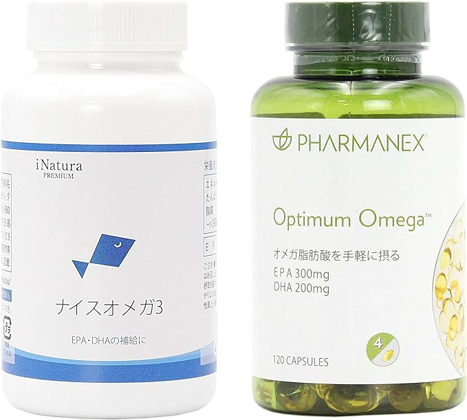 I Natura Premium Nice Omega A set of 3 1 item and Nu Skin (Pharmanex) Optimum Omega 1 item. [I Natura Nice Omega 3] Developed based on Nu Skin's Optimum Omega and Marine Omega. Omega-3 supplement made from 100% refined fish oil. For those who don't like blue fish or whose eating habits tend to be disordered. [Nu Skin Optimum Omega] Nu Skin's supplement containing omega-3 fatty acids EPA and DHA. *Please note that some of the barcodes on the labels may have been cut out or modified. ※