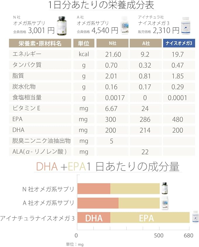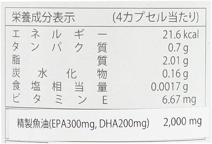 [Ai Natura Nice Omega 3] Refined fish oil containing EPA/DHA (manufactured in Japan)/gelatin, Glycerin, antioxidant (extracted VE) [Nu Skin Optimum Omega] Refined fish oil, vitamin E (derived from soybean), gelatin, glycerin, ethyl vanillin