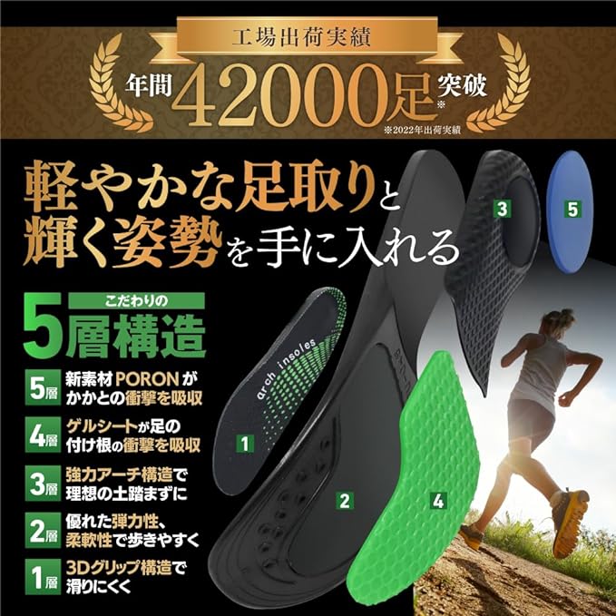 • 5-layer structure with special quality: 1 and 3D grip prevents slipping. 2. Excellent elasticity, flexibility and easy to walk. 3. Supportive arch construction for ideal arch. 4. Gel sheets absorb shock at the base of the foot. 5. The new PORON material absorbs the impact of the heel. Get a light step and a shining posture. The insoles exceed 42,000 pairs per year