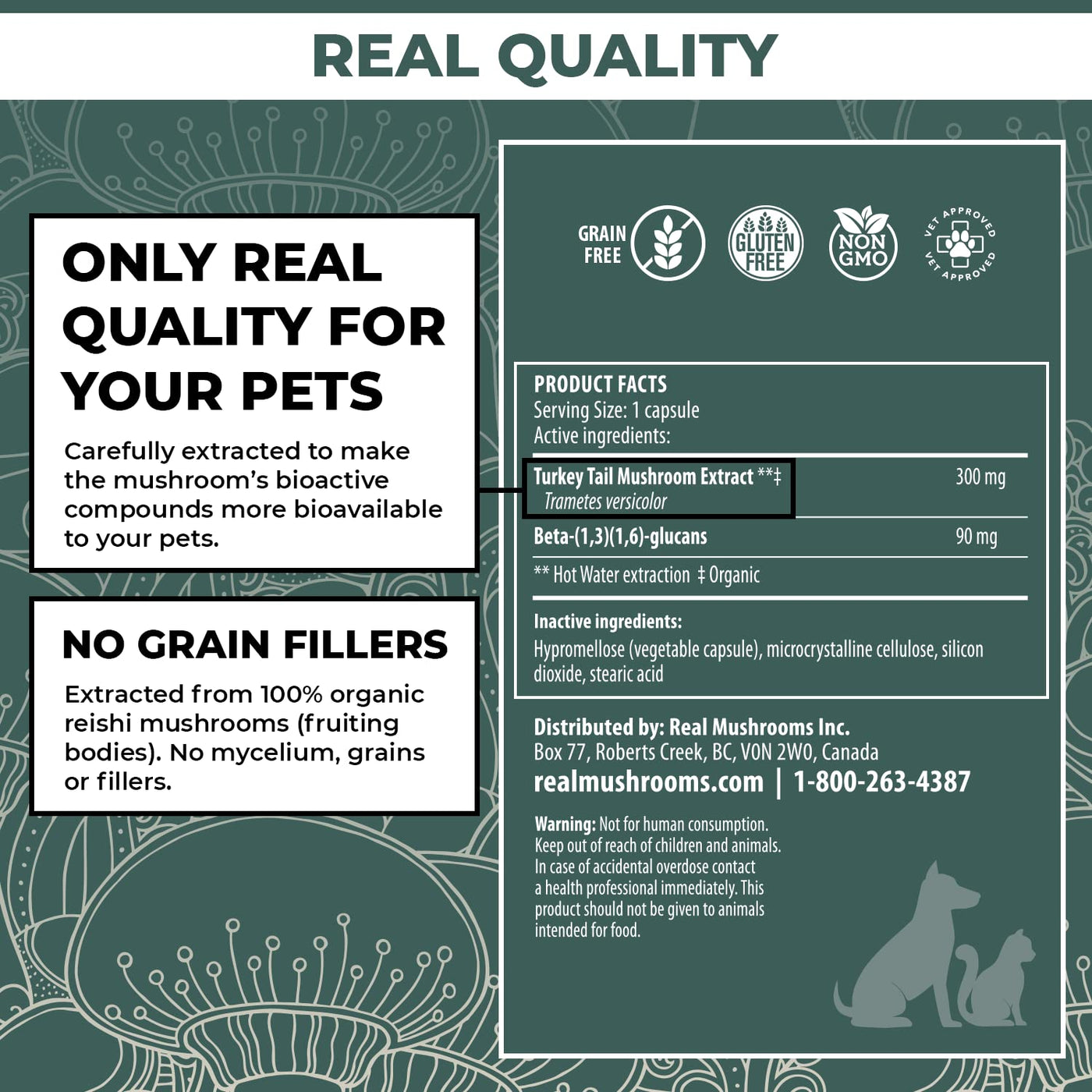 - Vet-Approved Cat & Dog Supplement Good for 90 Days: Our Turkey Tail mushroom capsules are manufactured in the USA in quality-controlled facilities. Our vitamins for dogs undergo rigorous quality control testing to give you gluten-free, grain-free, non-GMO, organic & vet-approved mushroom puppy supplements. Add these quality-proven & professional-recommended turkey tail mushroom for dogs to your collection of dog & cat health supplies today.