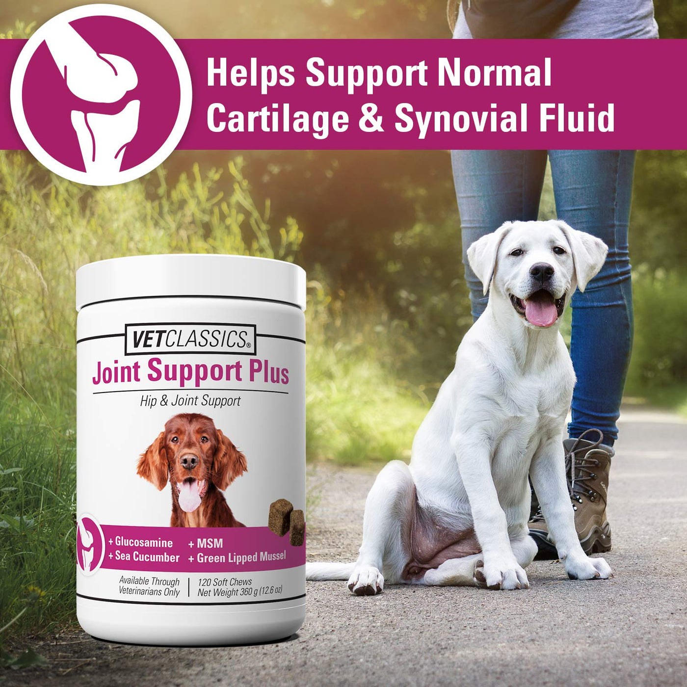 - THE ULTIMATE DOG JOINT SUPPORT SUPPLEMENT: Offer your canine companion the hip and joint support he needs with Vet Classics Hip, Joint Support Plus Dog supplement featuring antioxidants and ingredients designed to help alleviate discomfort from daily exercise.