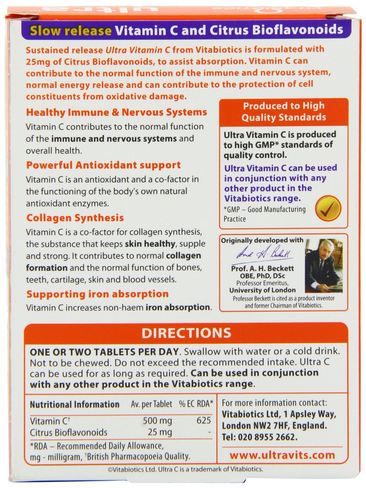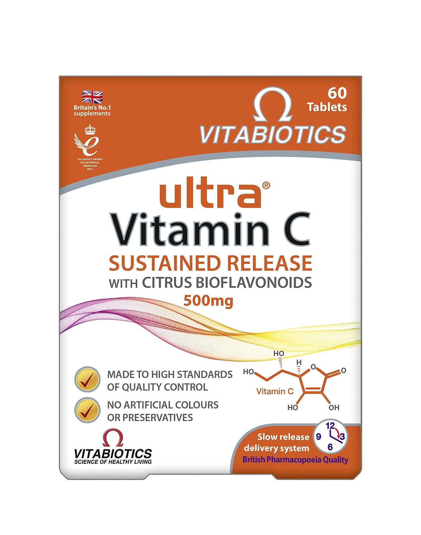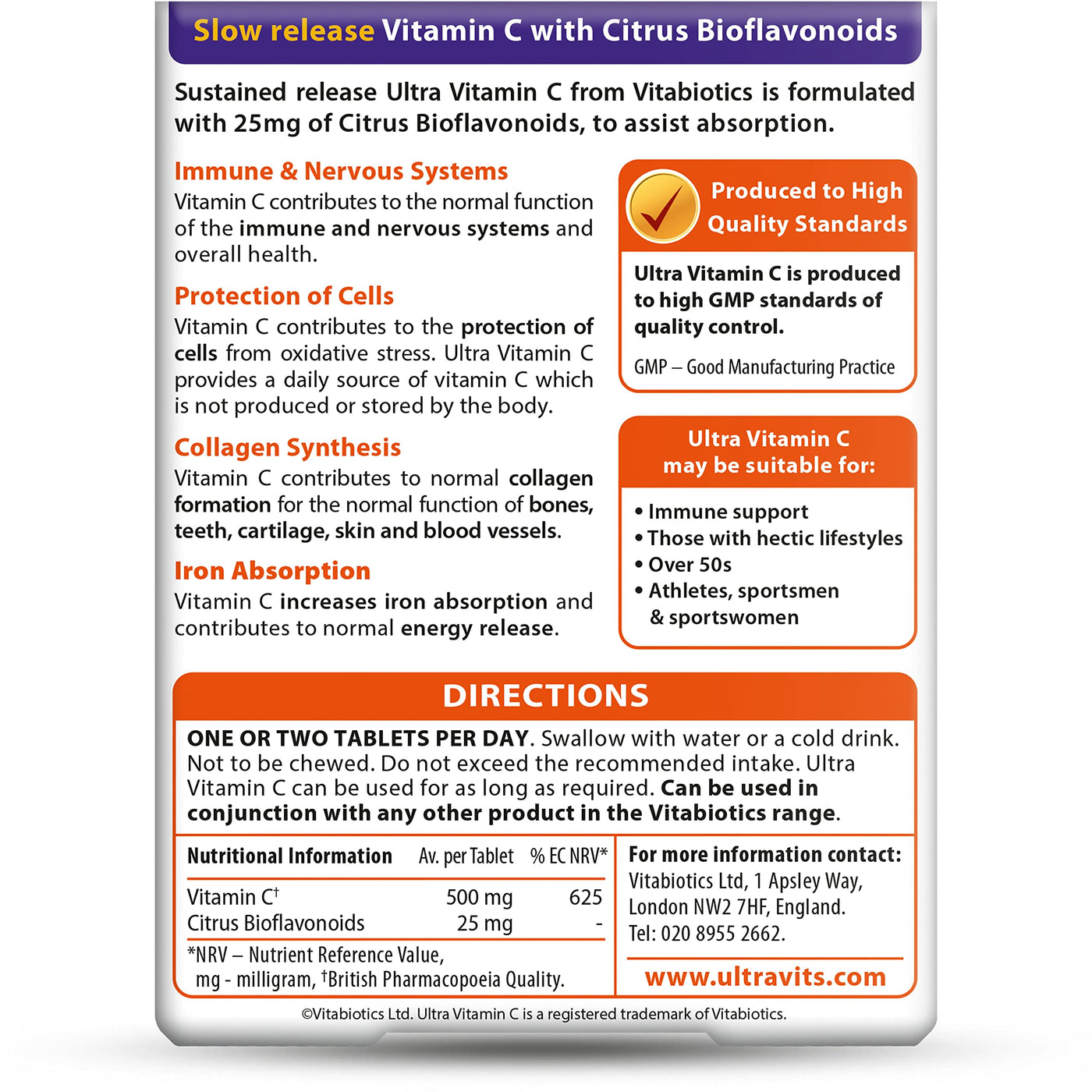 Ultra Vitamin C provides slow release vitamin C formulated with 25mg of citrus bioflavonoids, for maximum absorption and effectiveness. Ultra Vitamin C provides antioxidant support and contributes to normal function of the immune and nervous system. It increases non-haem iron absorption, the mineral essential for healthy blood formation and also supports normal collagen formation. Indications Generally, Ultra� Vitamin C may be used alongside medications, because it contains only moderate levels of slow release vitamin C and citrus bioflavonoids. Ultra� Vitamin C is free from any drugs or hormones. For specific advice on taking Ultra� Vitamin C with medicines, we recommend that you contact your doctor or pharmacist first. P.when('A').execute(function(A) { A.on('a:expander:toggle_description:toggle:collapse', function(data) { window.scroll(0, data.expander.$expander[0].offsetTop-100); }); }); Ingredients Tablet Ingredients: Vitamin C (Ascorbic Acid [Carrier: Hydroxypropylmethylcellulose]), Bulking Agents: Dibasic Calcium Phosphate & Microcrystalline Cellulose, Sustained Release Agent: Hydroxypropylmethylcellulose, Citrus Bioflavonoids, Anti-Caking Agents: Magnesium Stearate and Silicon Dioxide, Xanthan Gum. Allergy Advice: For allergens, see ingredients in bold. Directions One or two tablets per day. Swallow with water or a cold drink. Not to be chewed. Do not exceed the recommended intake. A regular intake is recommended. Safety Warning Always read the product directions before use. Do not exceed the recommended intake. As with other supplements, seek professional advice before using if you are pregnant, breastfeeding or suffer from food allergies, or are allergic to fish or fish products . If you have epilepsy or are taking oral anticoagulant (e.g. warfarin) consult your doctor or pharmacist before using this product. Vitamin supplements are not intended to treat or prevent any disease. Food supplements must not replace a balanced and varied diet, and a healthy lifestyle. Box Contains 60 x Tablets Manufacturer Contact Information ?Vitabiotics Ltd, 1 Apsley Way, London NW2 7HF, United Kingdom See more